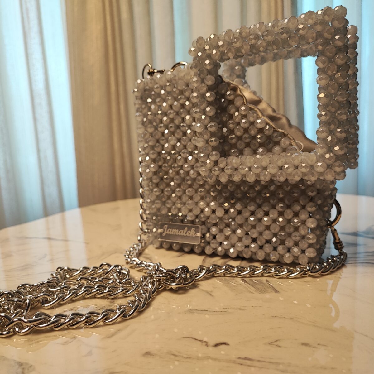 Crystal glass bead handbags, emphasizing their sparkle and elegance.
