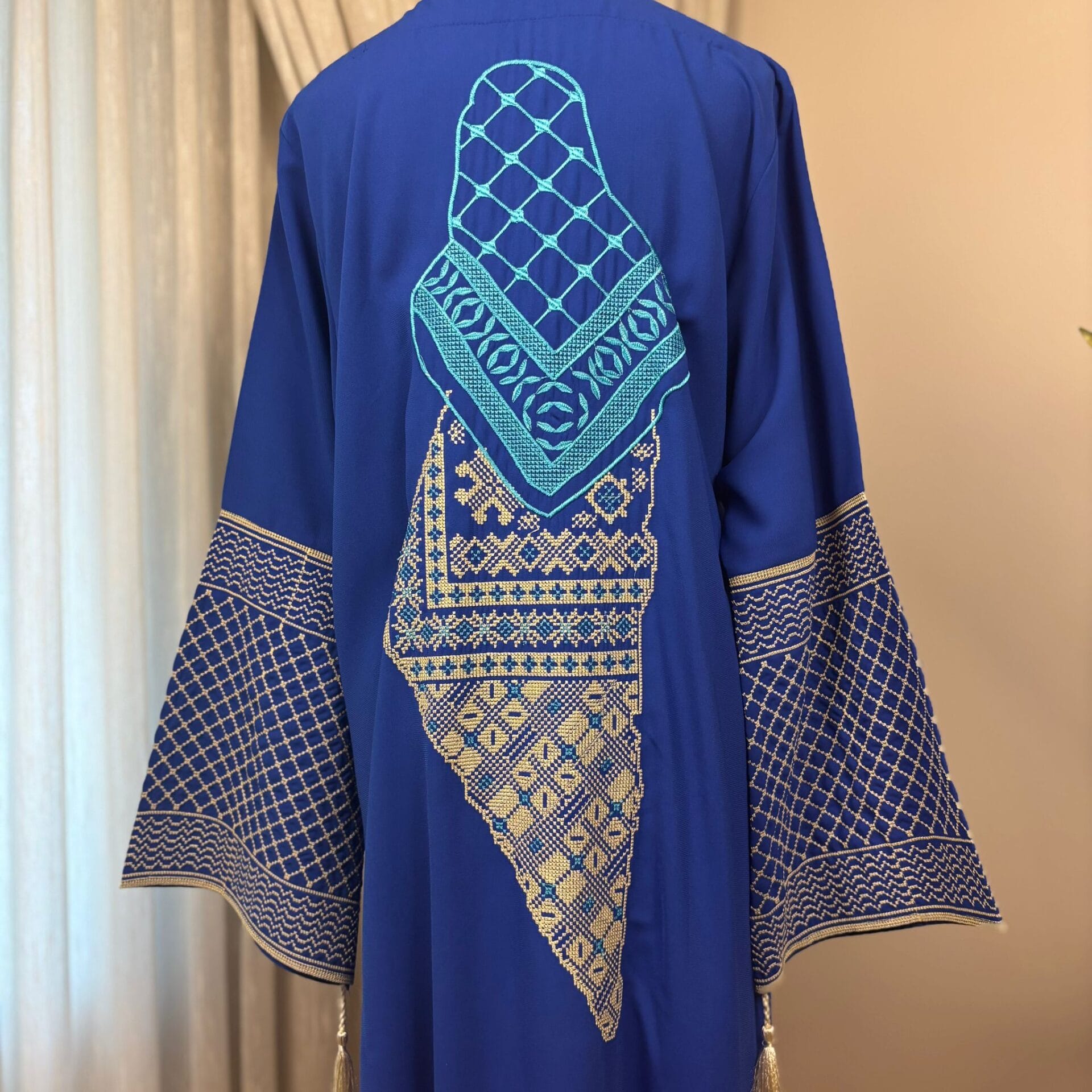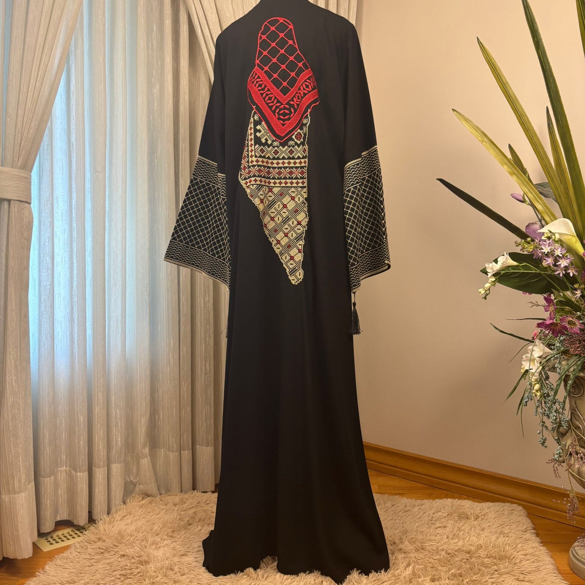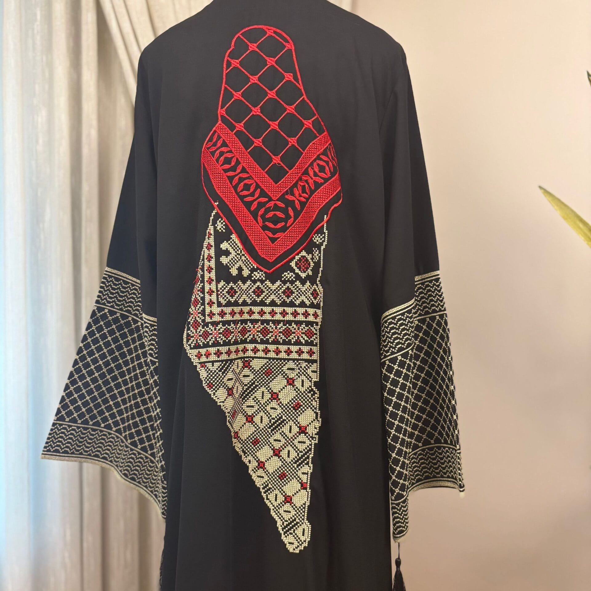 A statement Abaya from the Palestine Free Collection, blending traditional embroidery motifs with modern elegance. Designed with detailed sleeve patterns, tassel accents, and a bold embroidered back that carries the spirit of heritage with pride.