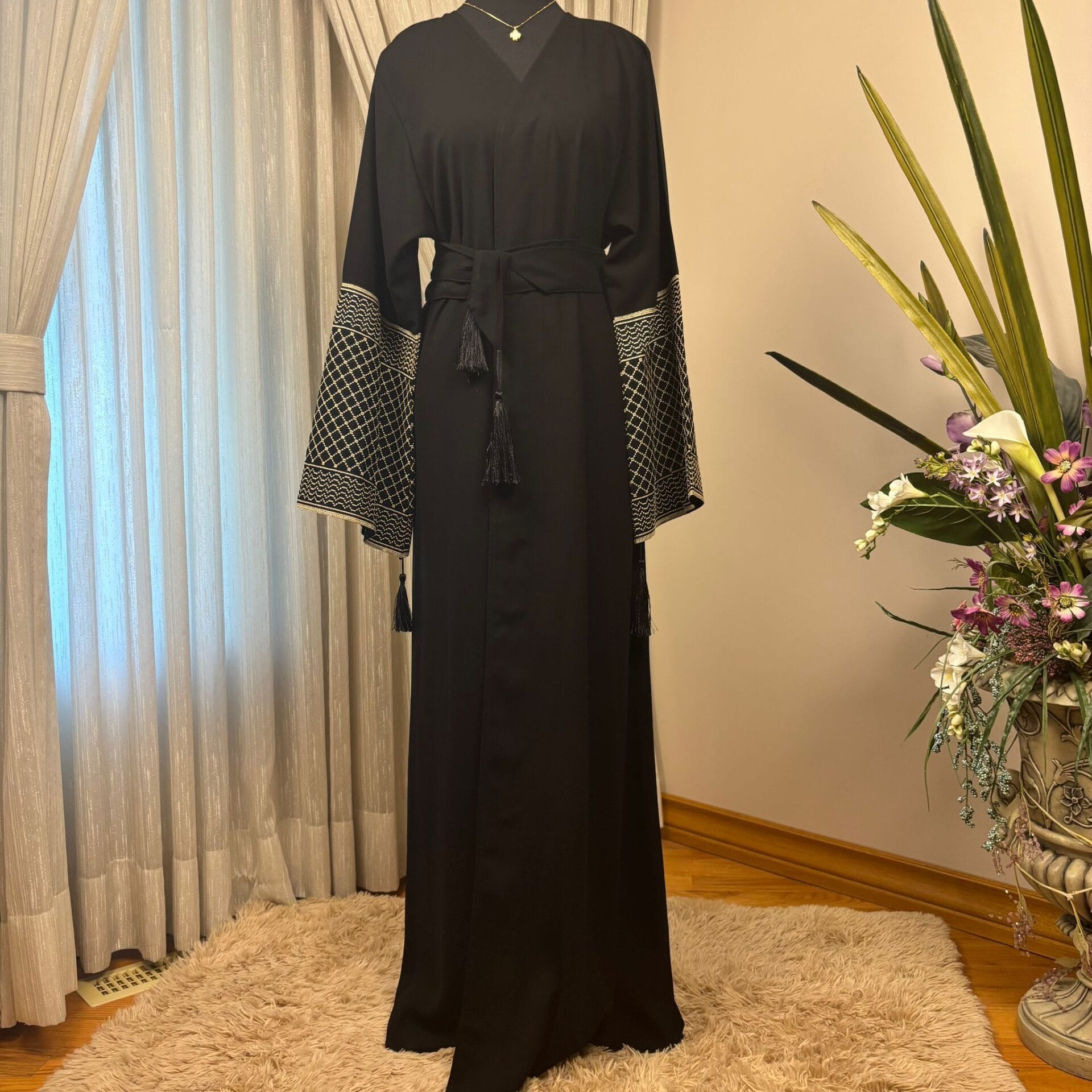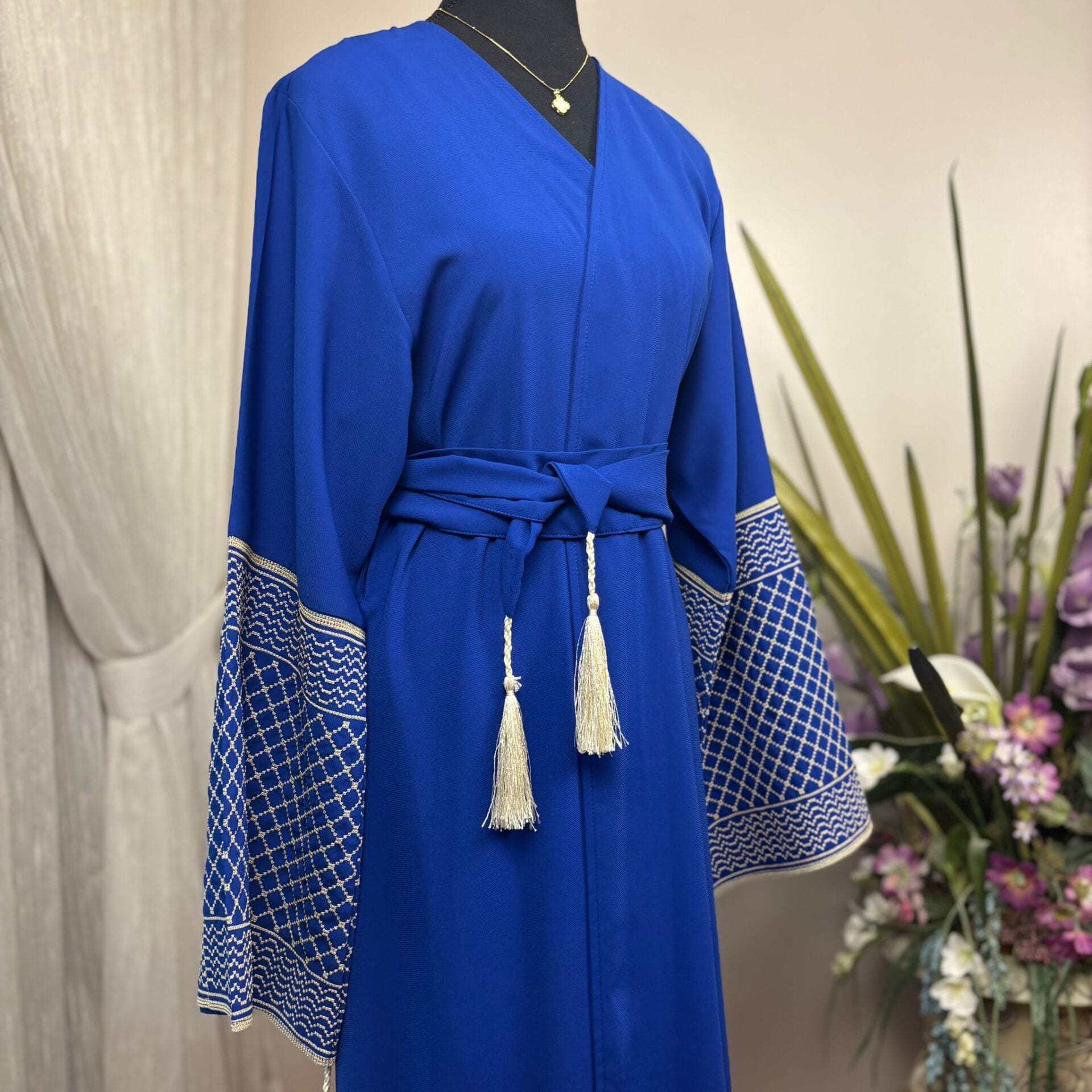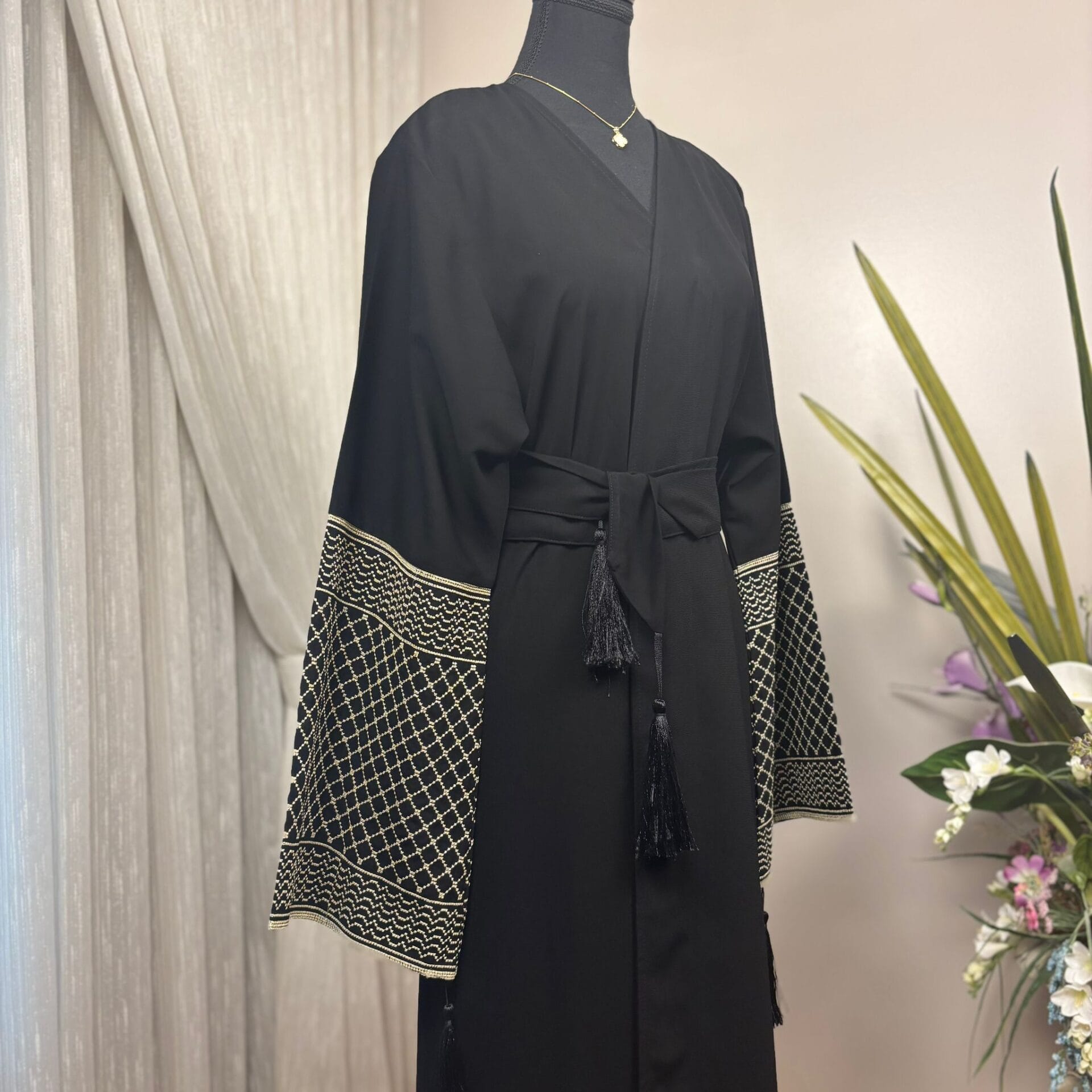 A statement Abaya from the Palestine Free Collection, blending traditional embroidery motifs with modern elegance. Designed with detailed sleeve patterns, tassel accents, and a bold embroidered back that carries the spirit of heritage with pride.