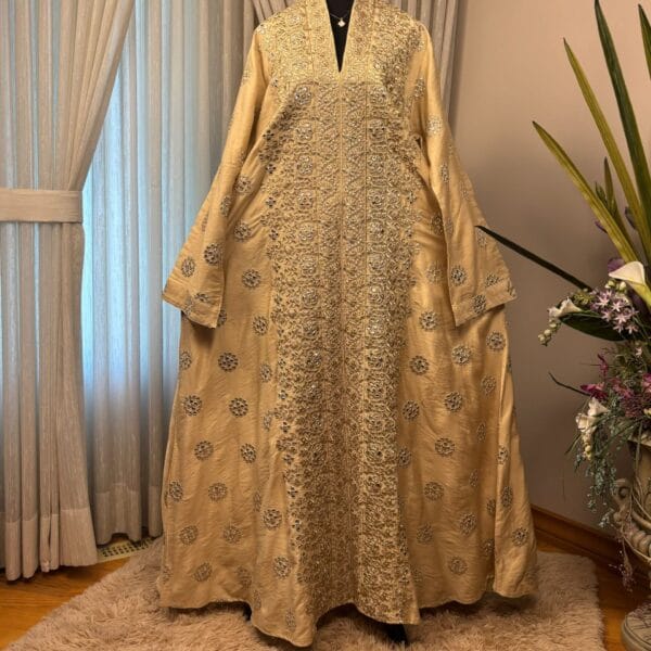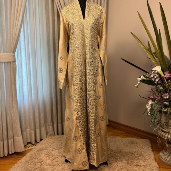 Step into timeless elegance with the Haya Majestic Radiance Abaya, a masterpiece of craftsmanship that blends traditional artistry with refined sophistication. This luxurious Abaya features lavish gold embroidery that cascades gracefully along the front and sleeves, creating a look of grandeur and poise. The wide, flowing silhouette ensures comfort while maintaining an effortlessly regal presence.