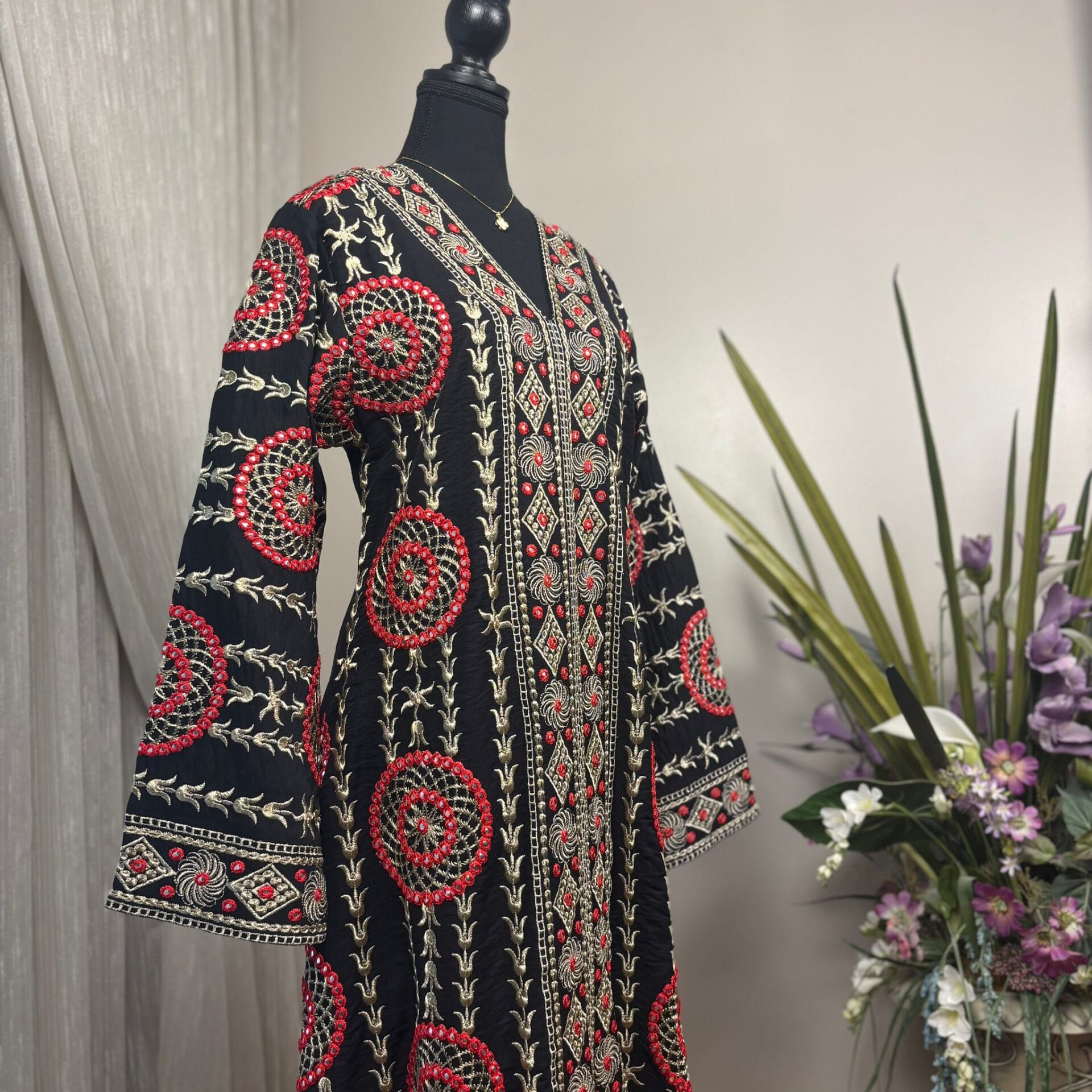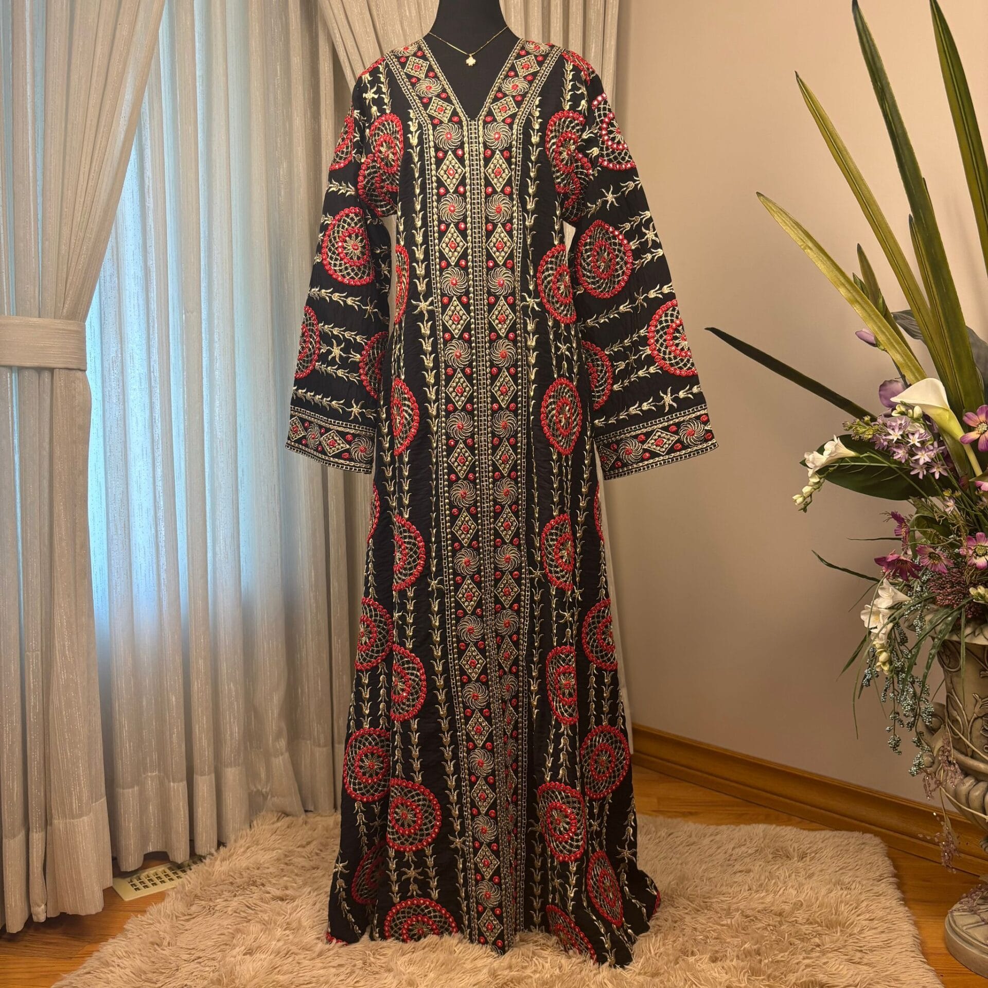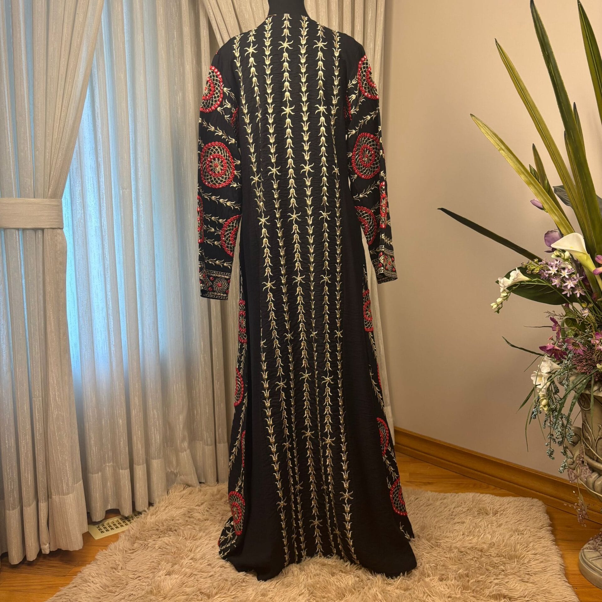 The Heritage Bloom Abaya is a celebration of cultural elegance, meticulously crafted with bold embroidery that brings history and artistry to life. Set against a deep black backdrop, the Abaya features intricate red and green floral medallions intertwined with delicate vine patterns, all running harmoniously along the front and sleeves.