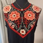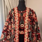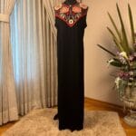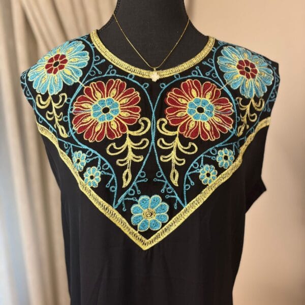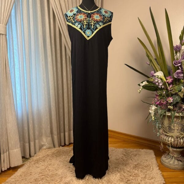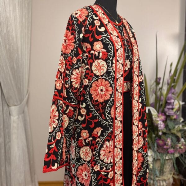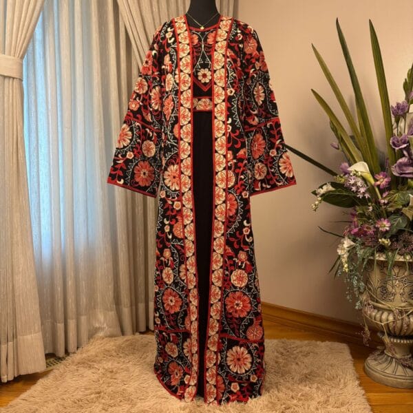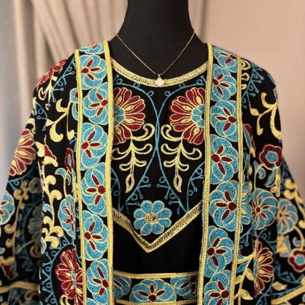 A two-piece Abaya set featuring a solid black base with vibrant, intricate embroidery in two colorways (red-gold and blue-gold). Includes a flowing outer robe and a matching inner dress for a modest, statement look.