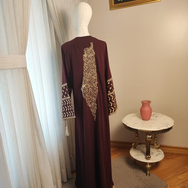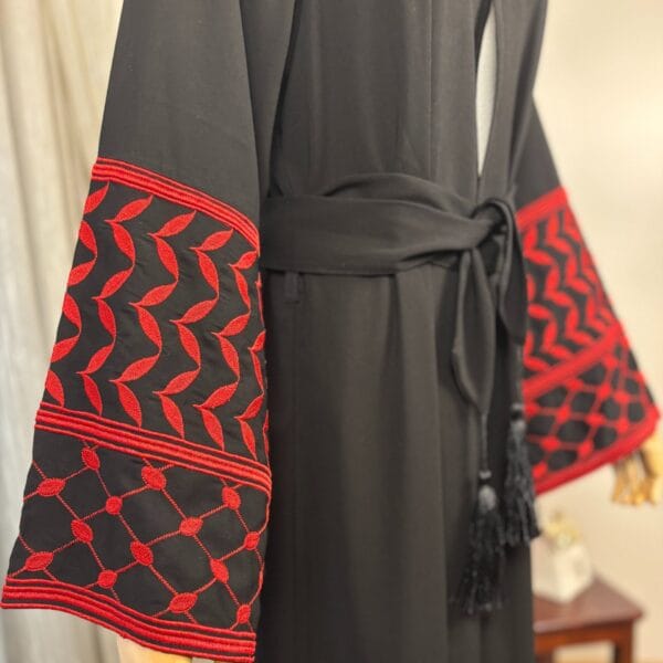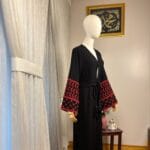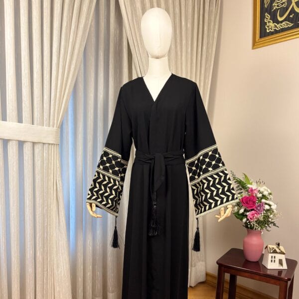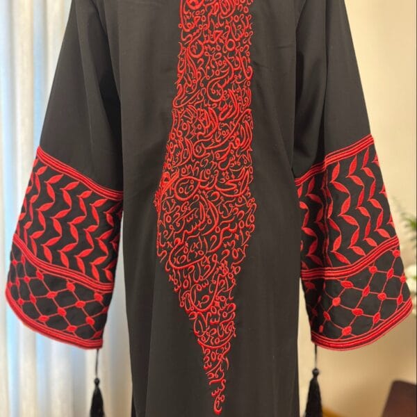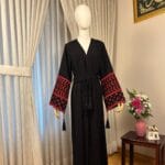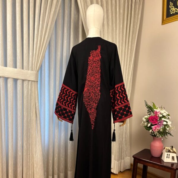 A beautiful traditional black abaya adorned with intricate and rich embroidery. The embroidery design features names of Palestinian towns and villages commemorating all that is Palestine.