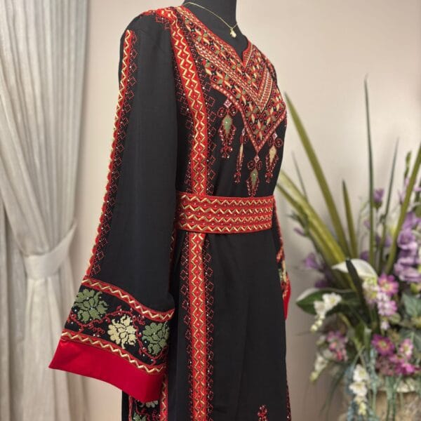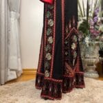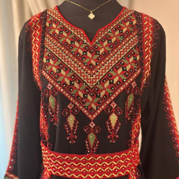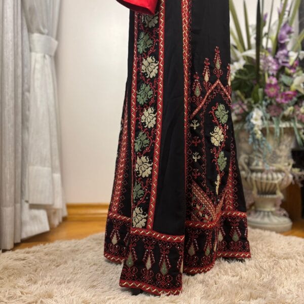 The Jamalek Palestinian Crimson Crown Abaya blends timeless elegance with bold, contemporary detailing. Crafted in a sumptuous black base, it is accented with intricate red and emerald embroidery along the yoke, cuffs, and hem, echoing traditional ornamental motifs. The design includes: