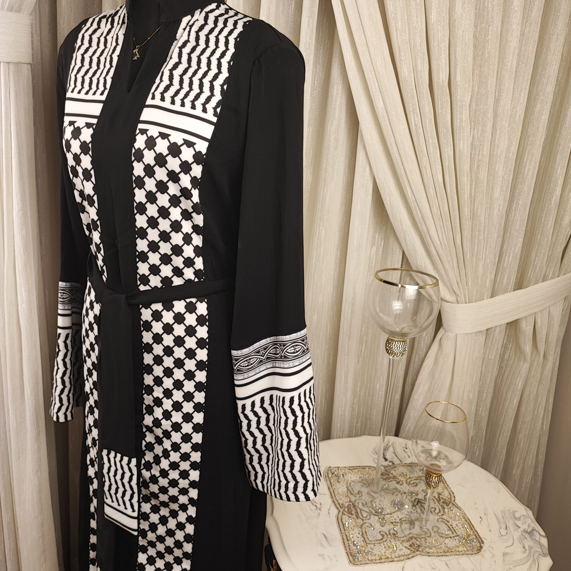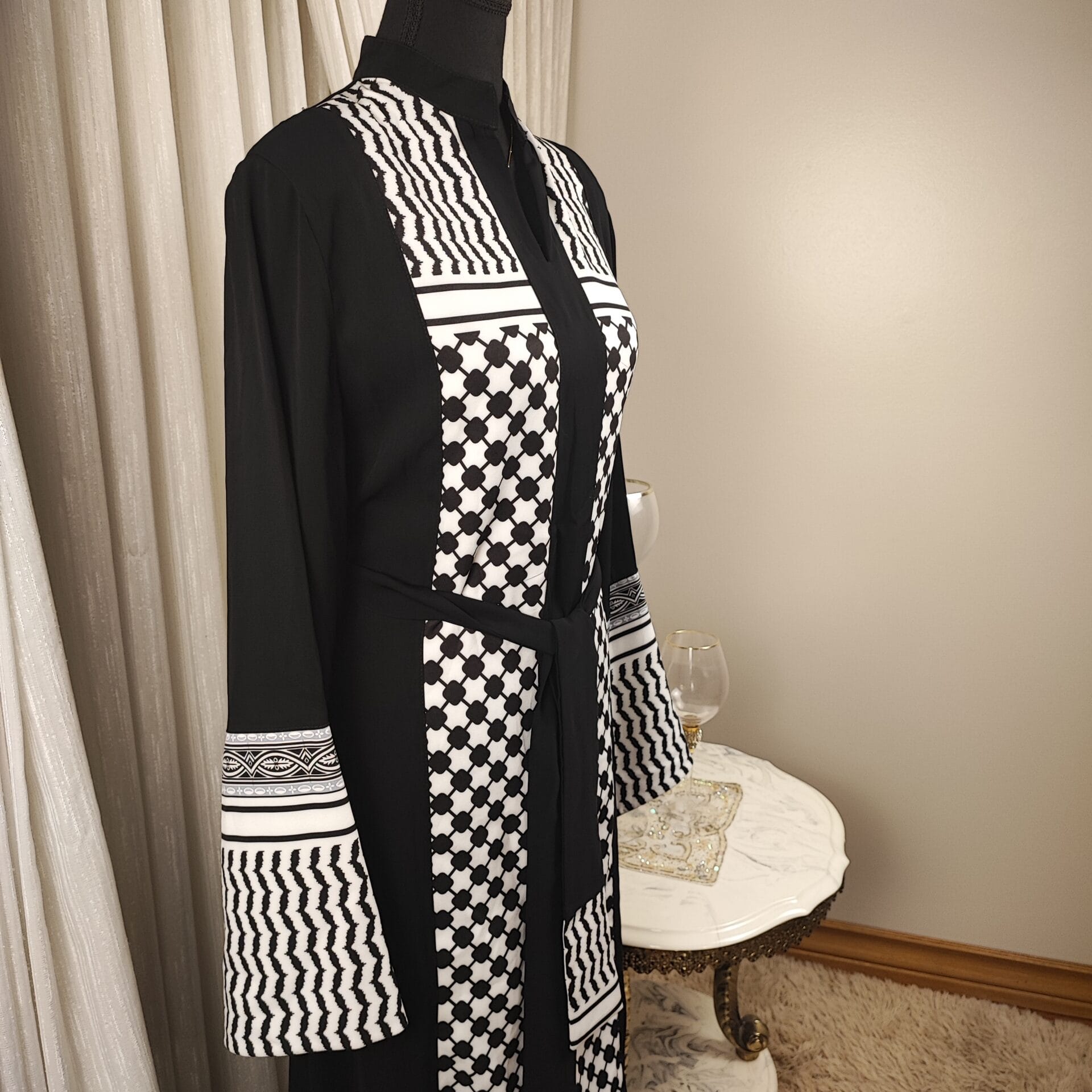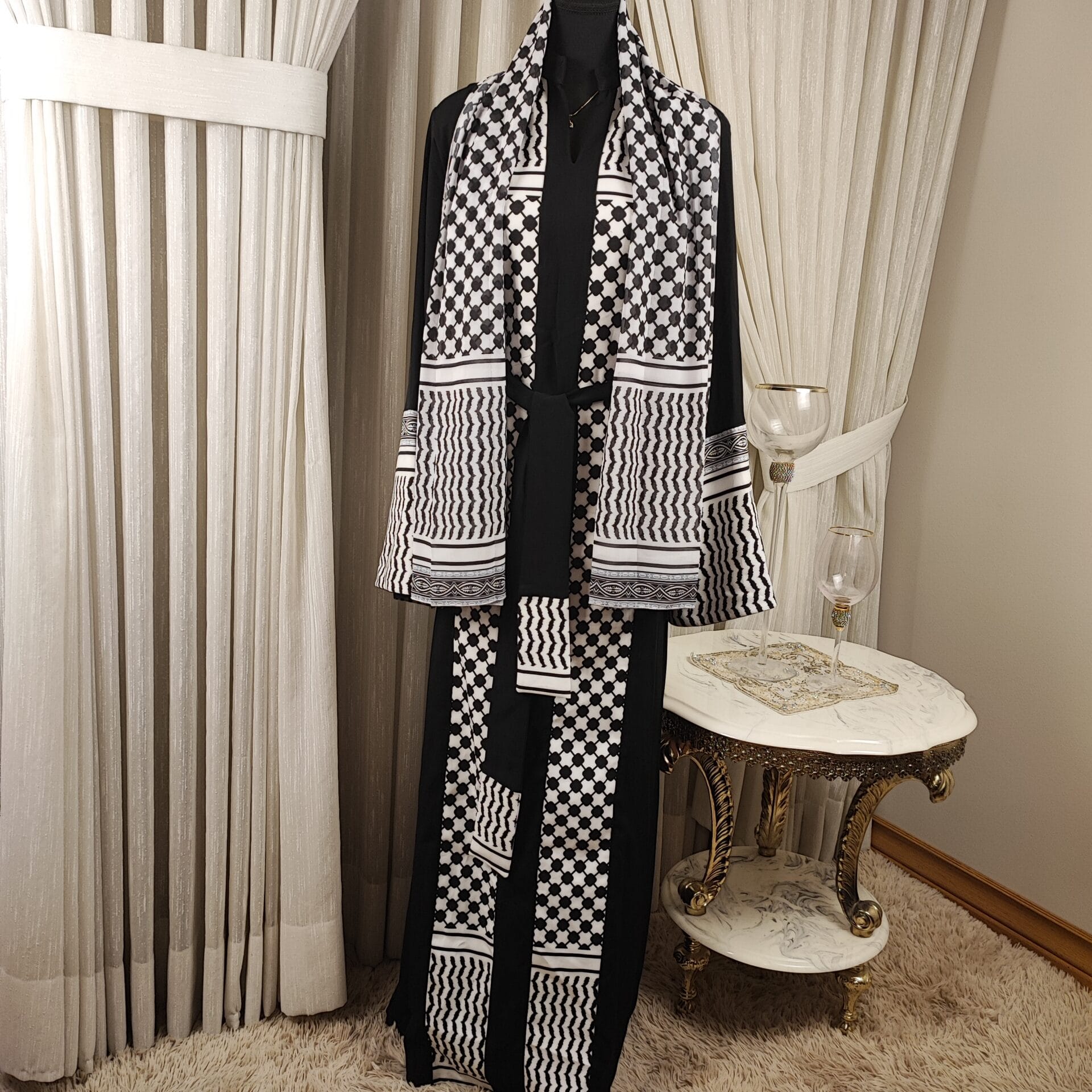 This exquisite black abaya features bold keffiyeh-inspired panels along the front, sleeves, and belt — a modern expression of unity and pride.
