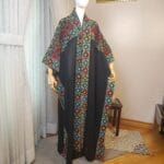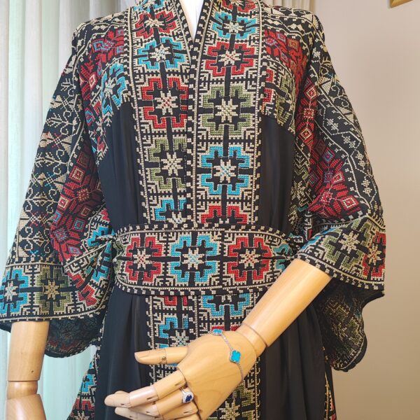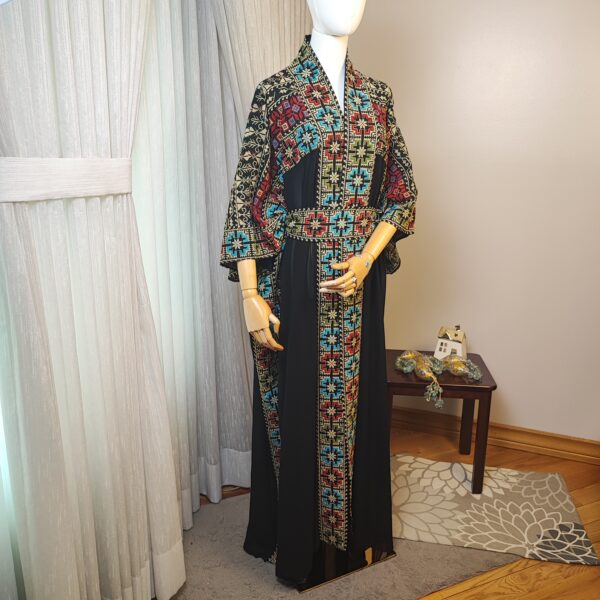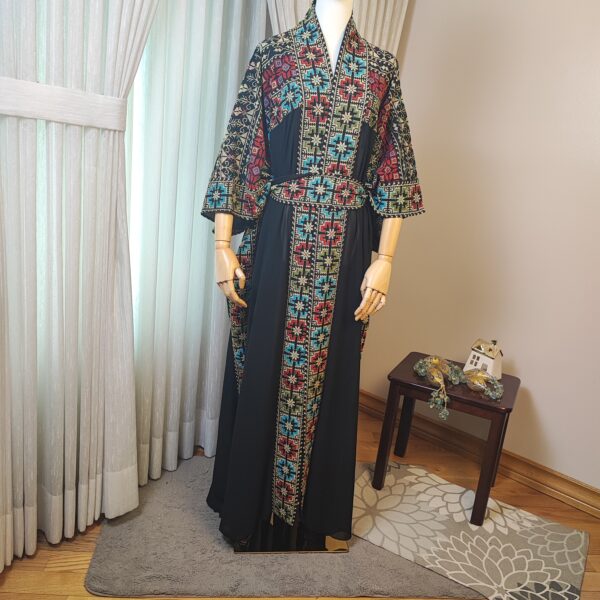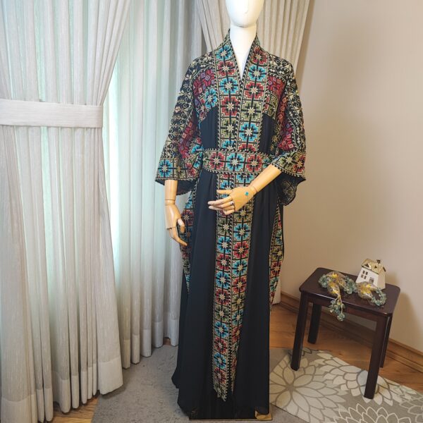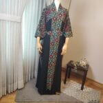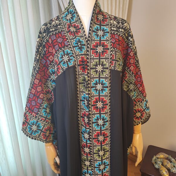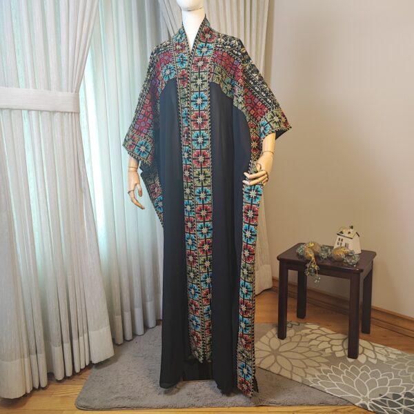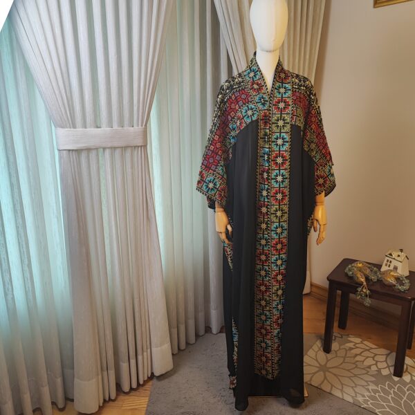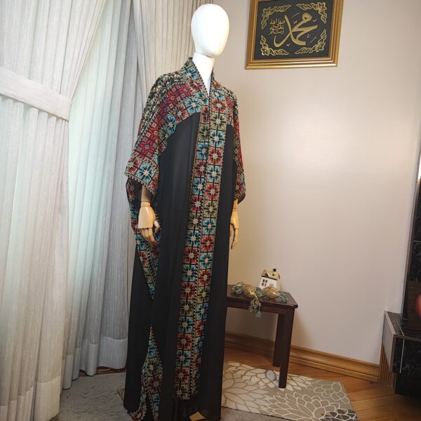 Step into tradition and elegance with the Tatreez Turkish Handmade Abaya. Adorned with exquisite Palestinian embroidery in bold red, blue, and green patterns on a luxurious black fabric, this abaya is a testament to heritage and craftsmanship.