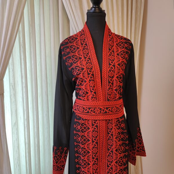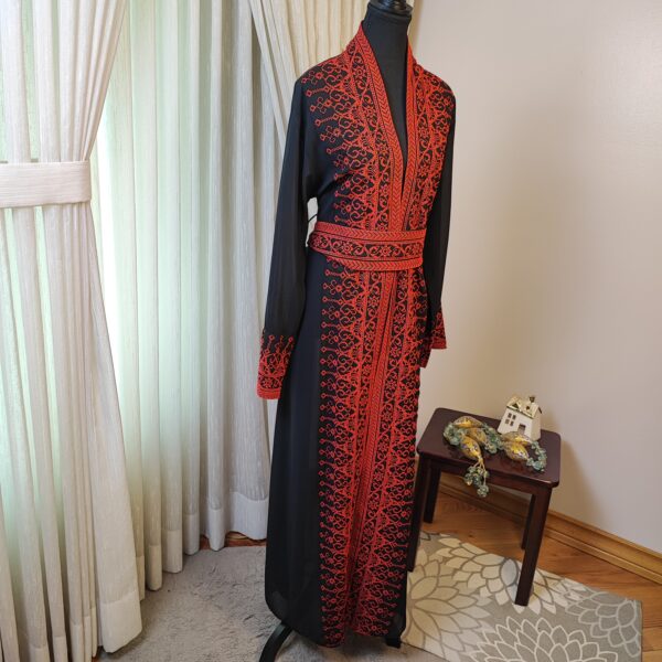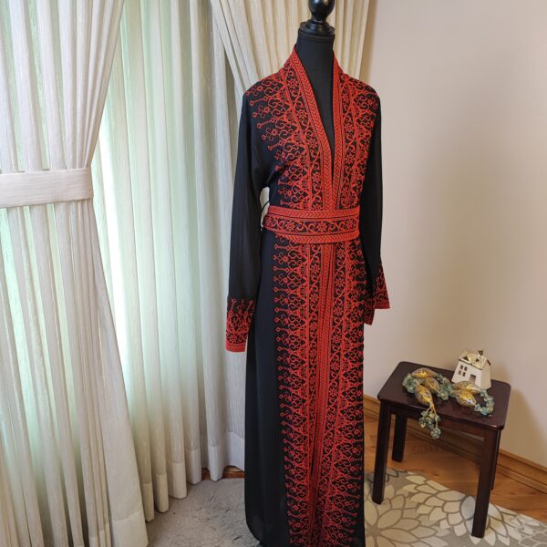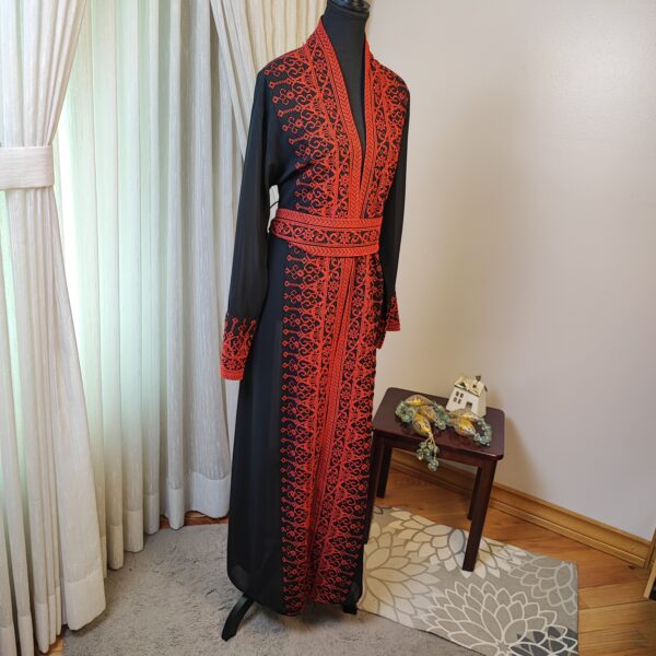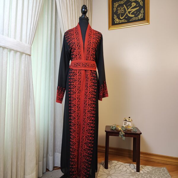 The Tatreez Classic Heritage Turkish Handmade Embroidered Abaya – Black with Red Embroidery is a captivating representation of cultural heritage and fine craftsmanship. Adorned with intricate hand-stitched red embroidery patterns inspired by traditional Palestinian motifs, this abaya is a perfect blend of tradition and elegance.