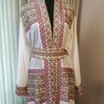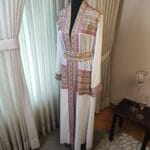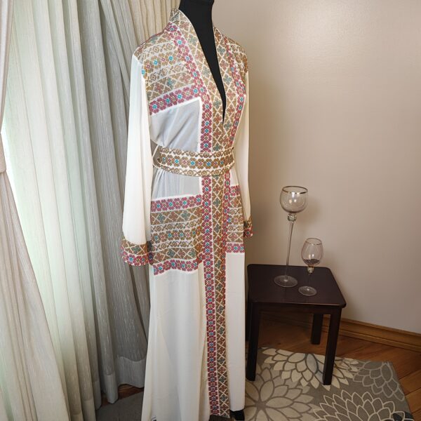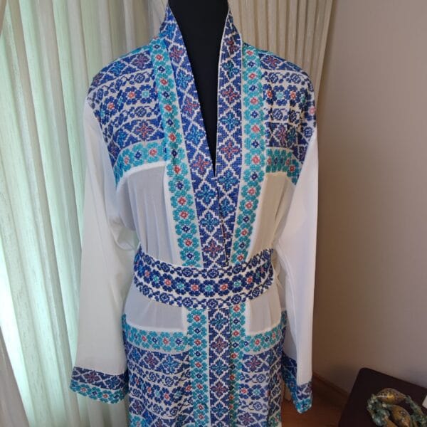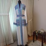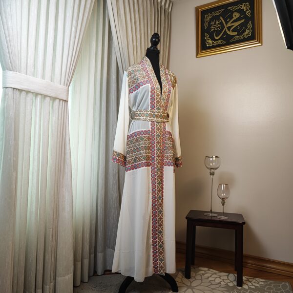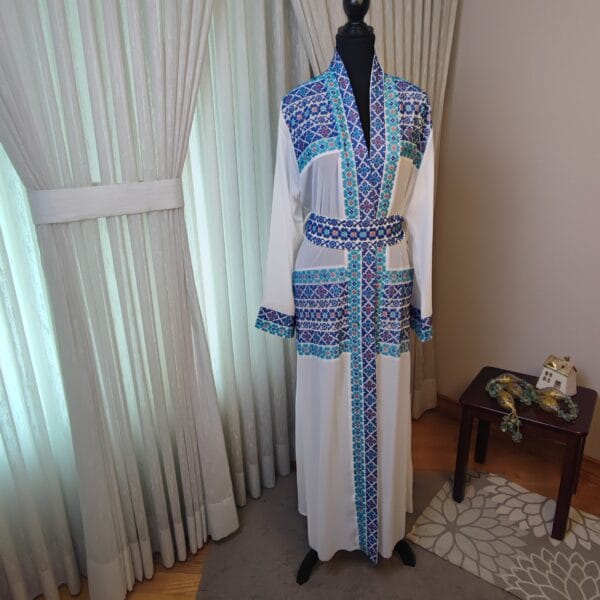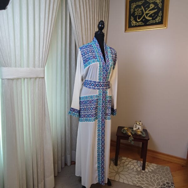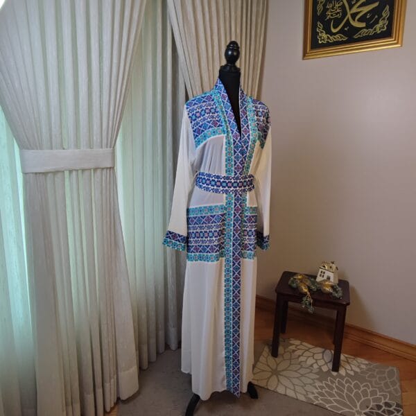 The “Royal Mosaic” abaya is a breathtaking fusion of tradition and elegance, adorned with intricate Tatreez-inspired embroidery in stunning shades of blue, gold, pink and turquoise. The symmetrical patterns resemble the timeless beauty of mosaic artistry, creating a regal and refined look. Crafted from flowing white fabric with exquisite detailing along the sleeves and front, this piece is perfect for those who appreciate heritage with a modern touch. Whether for a grand occasion or an elevated everyday look, the “Royal Mosaic” abaya is a statement of grace and cultural pride.