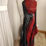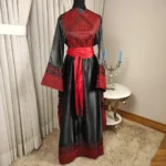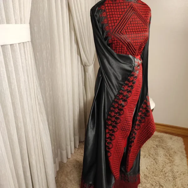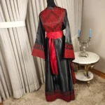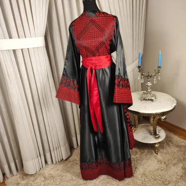 This Abaya is made from a shiny black fabric, with striking red traditional handmade Tatreez embroidery that decorates the upper chest, shoulders, and cuffs of the wide sleeves. The embroidery features geometric and floral motifs, adding an ornate touch. The waist is accentuated with a wide, bright red sash tied in a bow, creating a vibrant contrast against the black fabric. The length of the Abaya flows gracefully, with additional embroidered details near the hem, providing an elegant and sophisticated look suitable for special occasions.