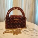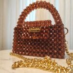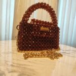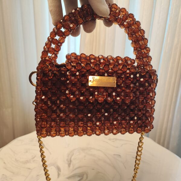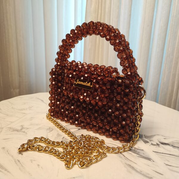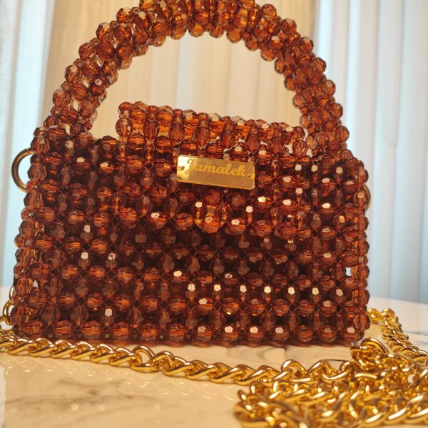 This exquisite handbag is crafted from rich, amber-toned acrylic beads, creating a warm and sophisticated look. The faceted beads catch the light beautifully, giving it a subtle sparkle. It features a sturdy beaded handle for an elegant grip and a detachable gold chain strap for versatile styling. The compact, structured design is complemented by a gold-toned nameplate with the “Jamalek” branding, adding a refined touch.
