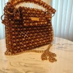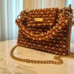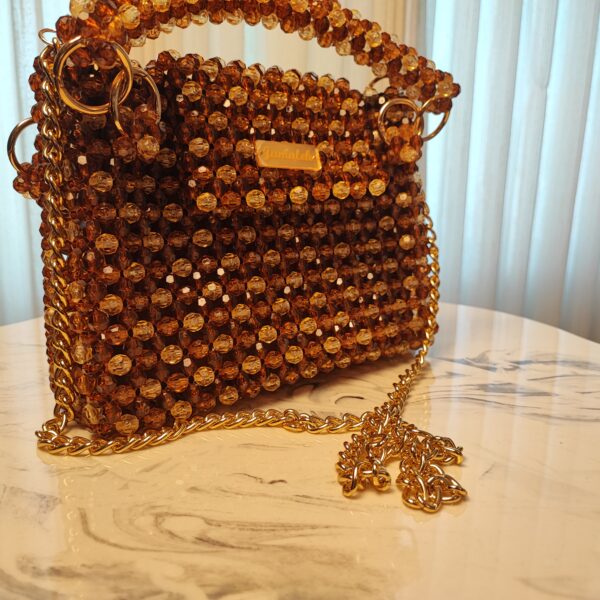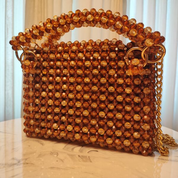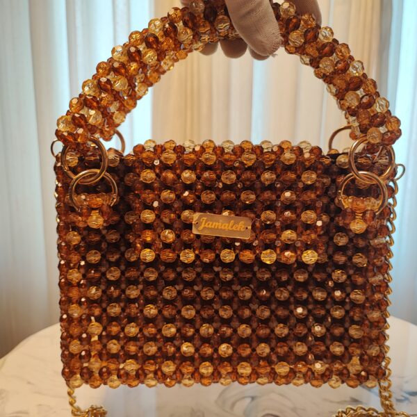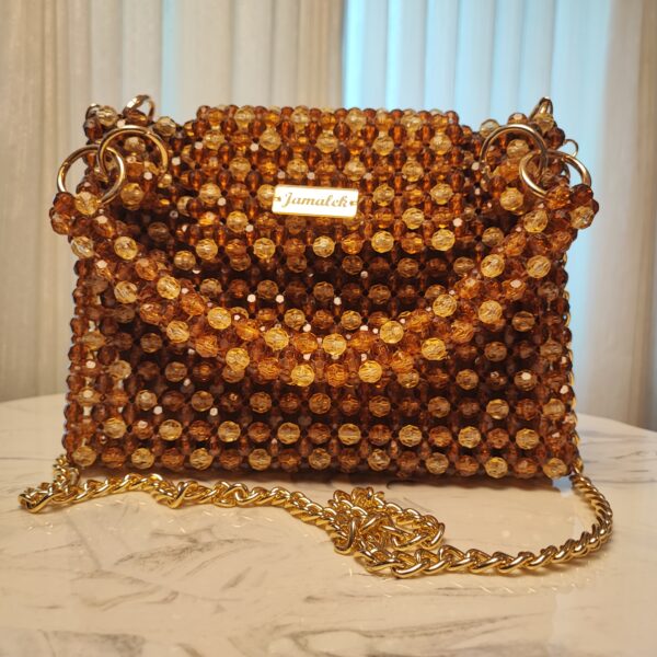 This stunning handbag is meticulously crafted from rich amber-hued acrylic beads, giving it a warm and elegant glow. The faceted beads reflect light beautifully, creating a luxurious shimmer. The bag features a spacious and structured design with a gracefully draped beaded handle, adding a touch of sophistication. Complementing its design is a detachable gold chain strap, offering versatile carrying options. The signature gold-toned “Jamalek” nameplate adds a refined finishing touch, making this handbag an exquisite statement piece.