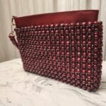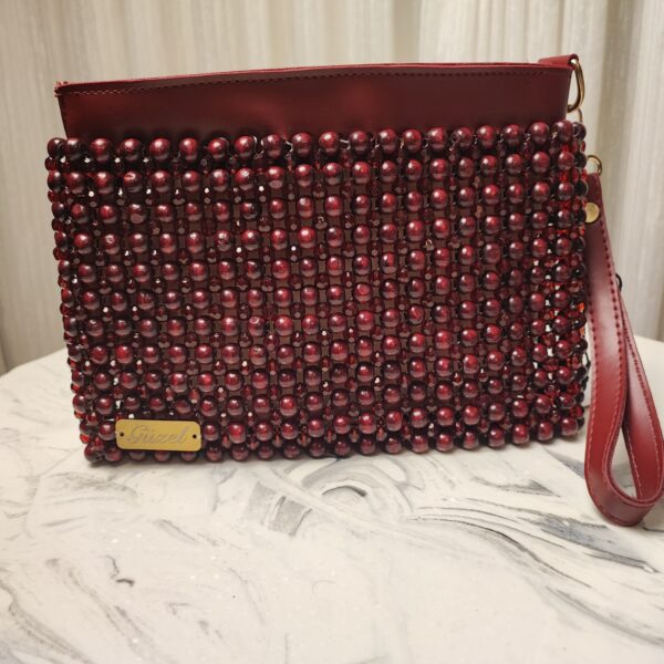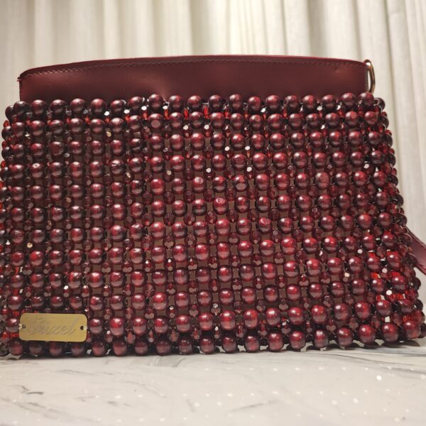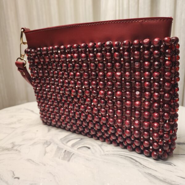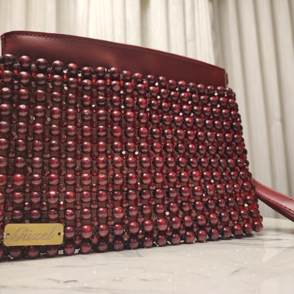 This Natura Luxe handbag is a bold and sophisticated piece, seamlessly blending natural materials with a luxurious aesthetic. The deep red wooden beads, arranged in an intricate woven pattern, create a striking texture that catches the light beautifully. The structured rectangular silhouette is enhanced by a rich burgundy leather trim, offering durability and elegance. A matching leather strap provides comfort and versatility for everyday wear.