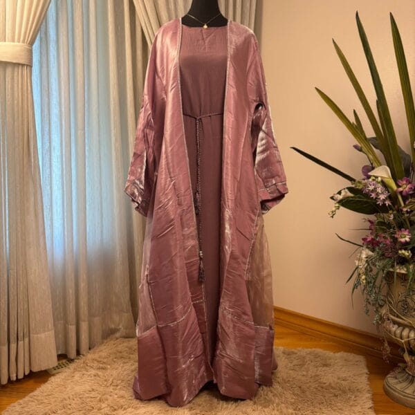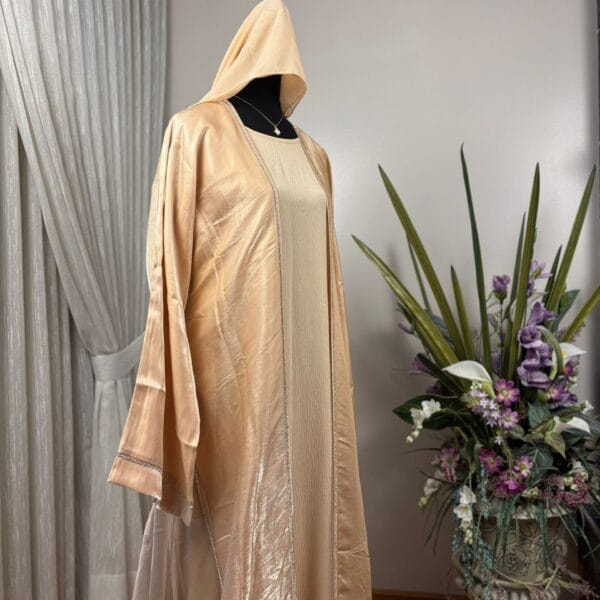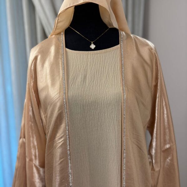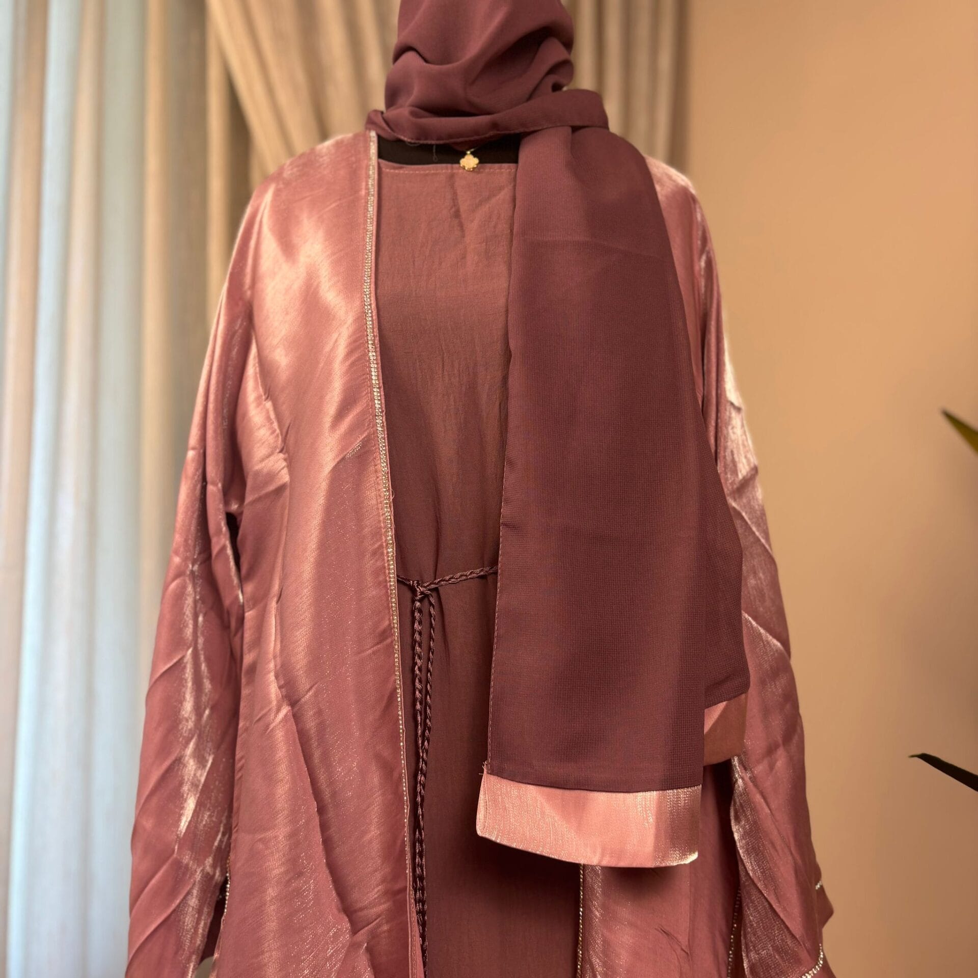 The Amira Glow Abaya embodies effortless elegance and modern modesty. This two piece Abaya is designed with a radiant, silky-textured fabric that subtly shimmers under the light. Its flowing cut offers both comfort and style, while the understated stitched detailing along the edges enhances its refined finish. To complete the look, it comes with a perfectly matched hijab, making it an all-in-one ensemble ideal for both special occasions and elevated everyday wear.