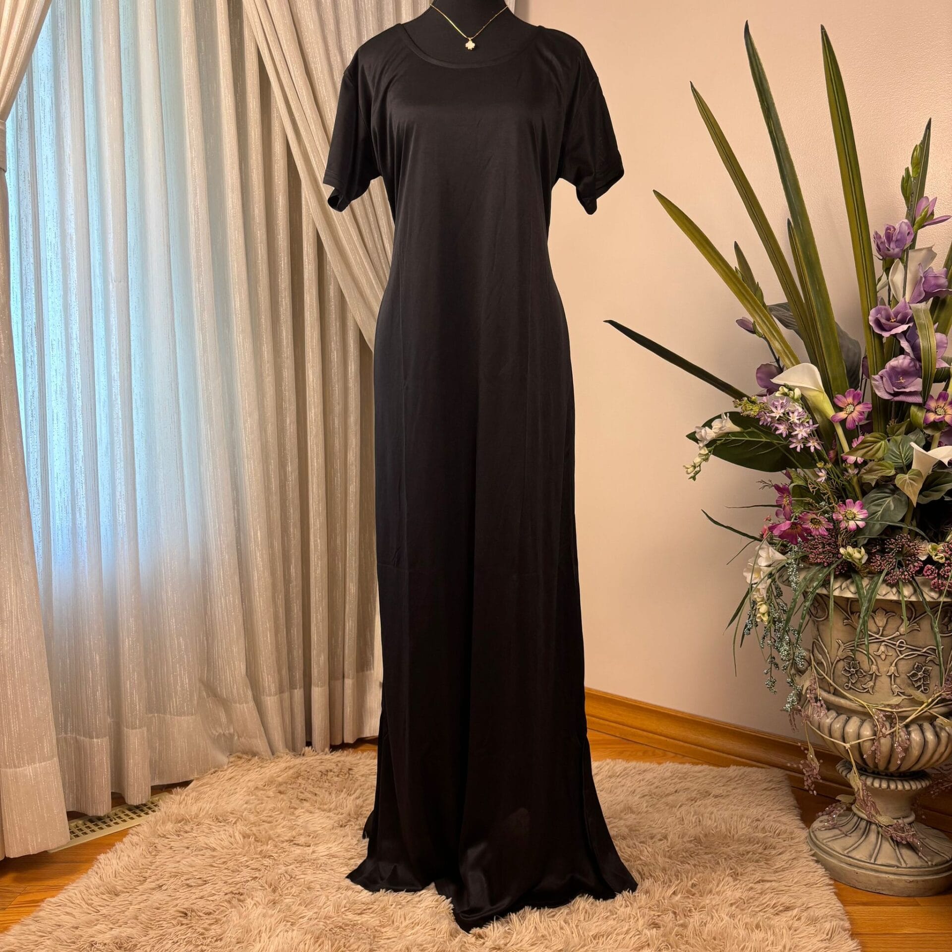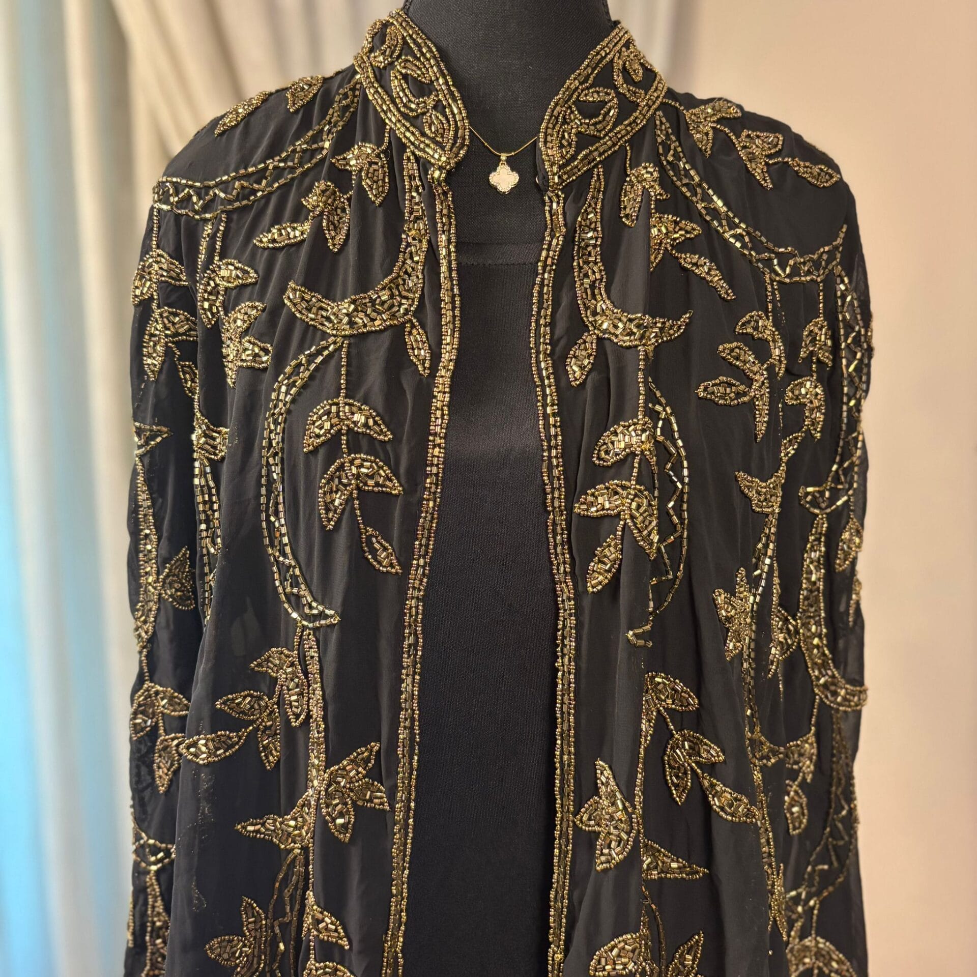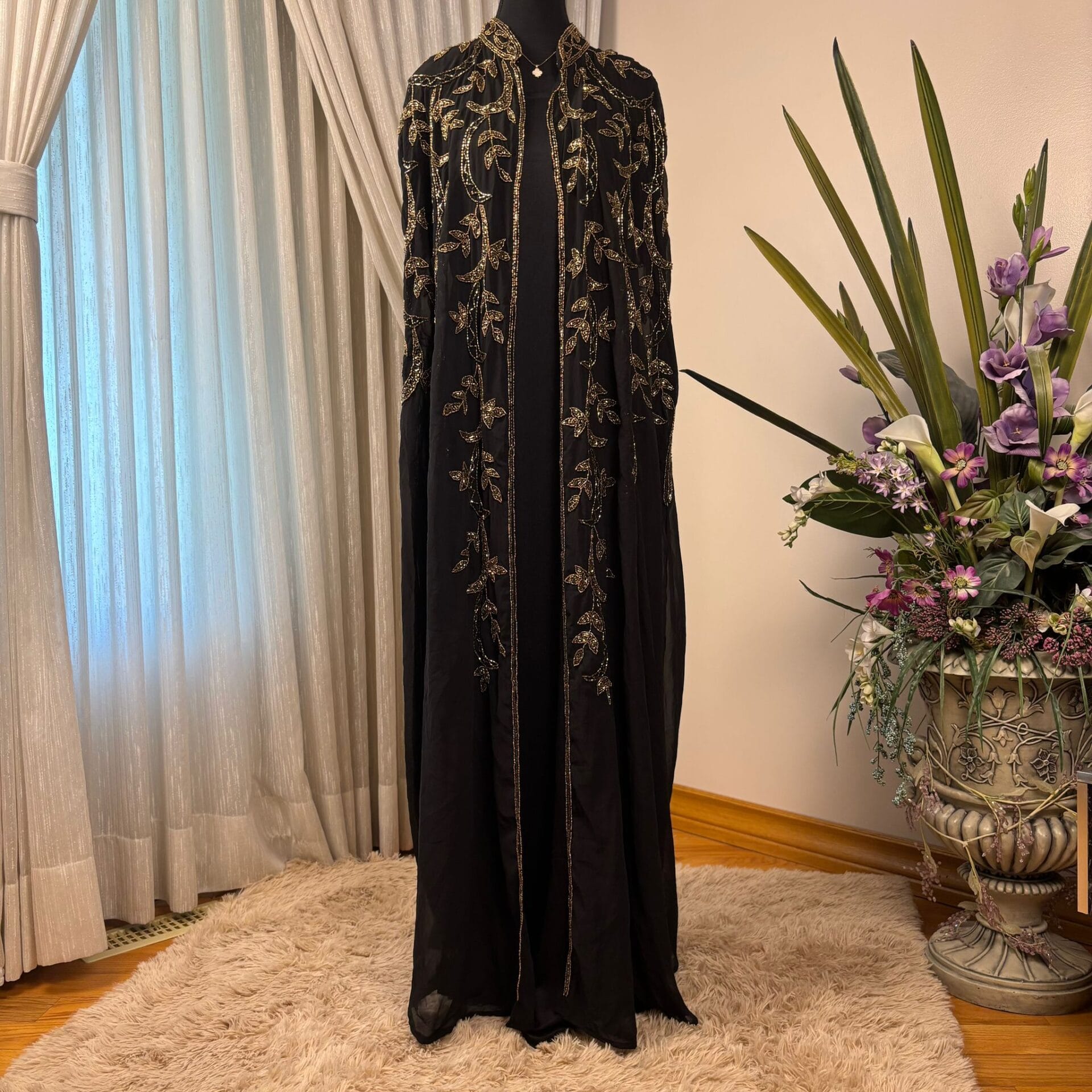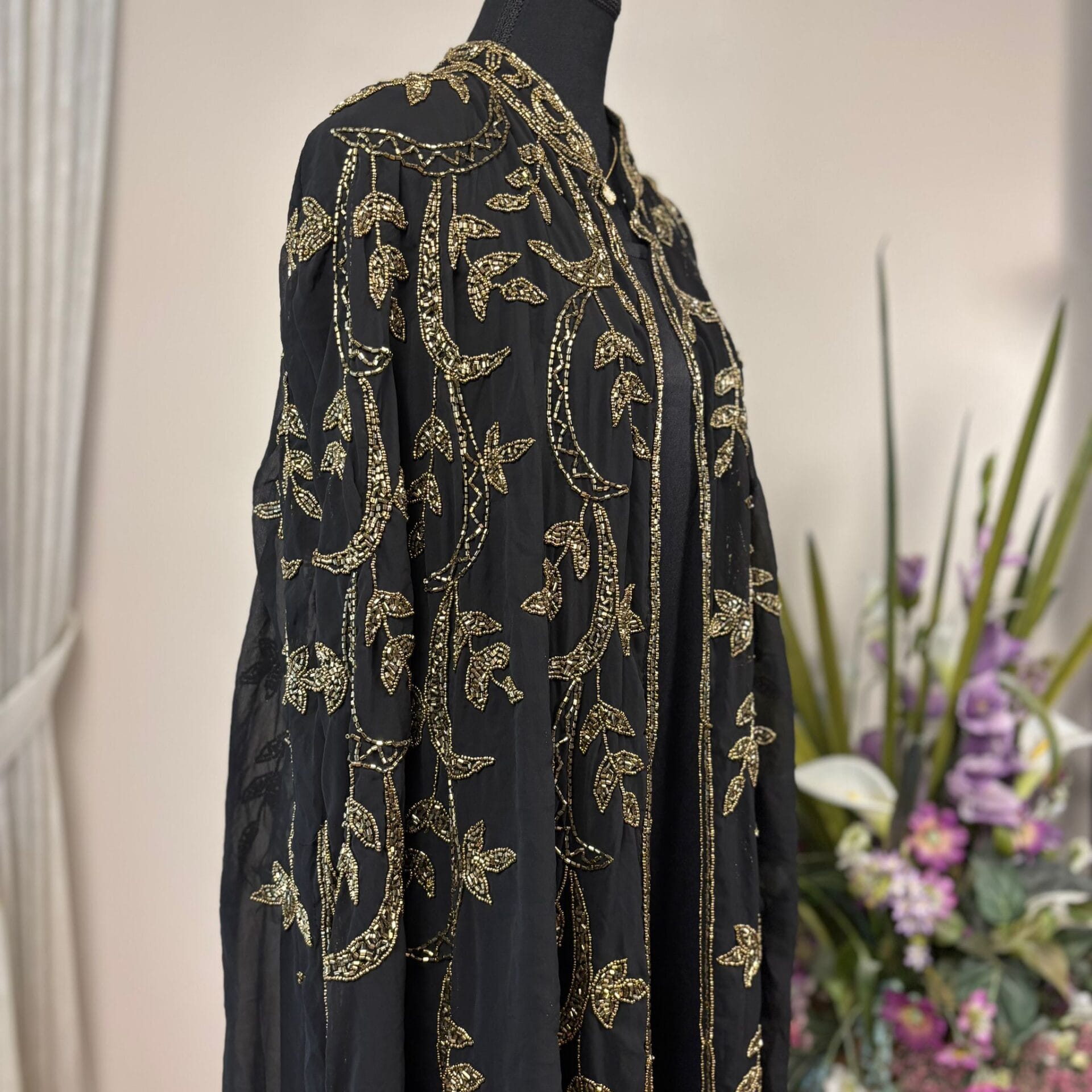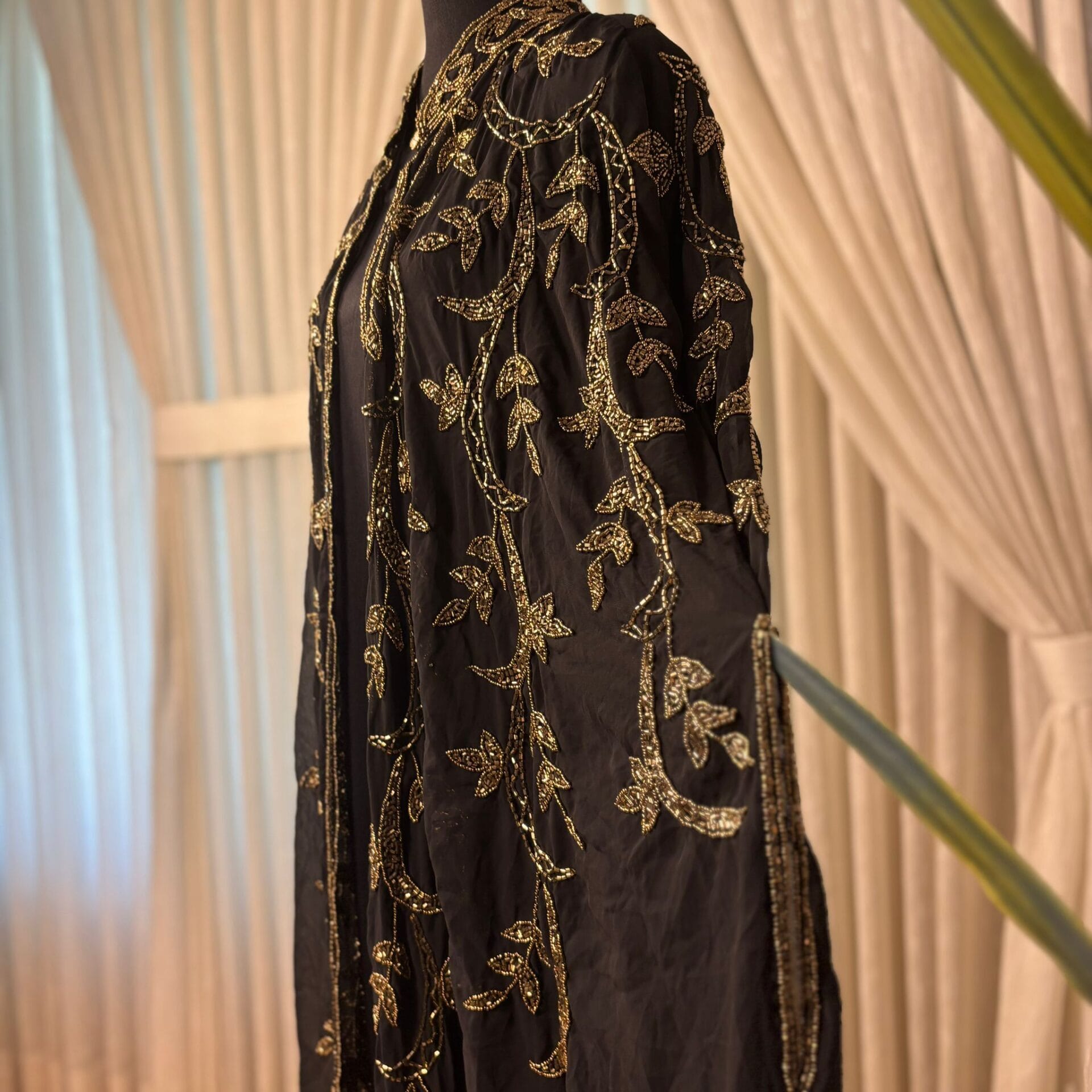 This elegant Abaya is crafted in deep black fabric and cut to a full-length, flowing silhouette. The standout feature is the ornate gold-bead embroidery that traces vines and leaves across the shoulders, down the sleeves, and along the front opening. The embroidery is complemented by matching gold piping that runs the length of the front, enhancing the garment’s vertical line and adding a refined shimmer. The piece is paired with a simple black inner dress to allow the beaded details to take center stage, making it ideal for formal events or special occasions while maintaining modesty and sophistication.