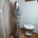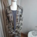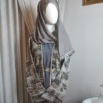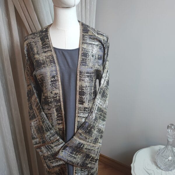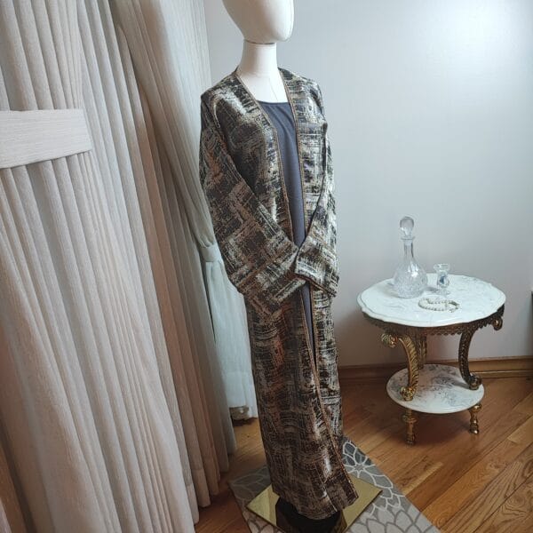 A luxurious tweed-textured open Abaya in neutral tones, designed for timeless sophistication and effortless grace.