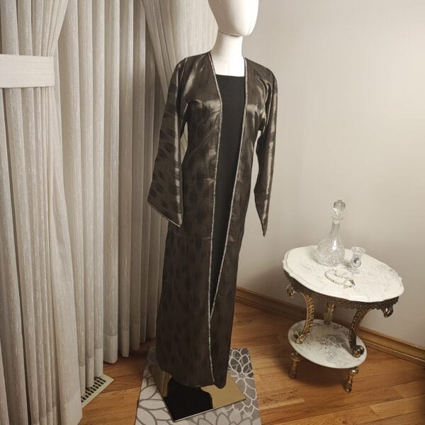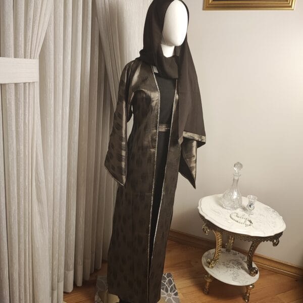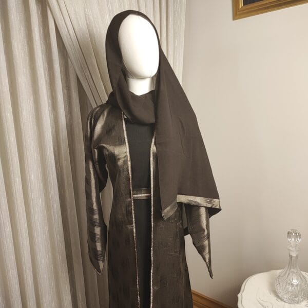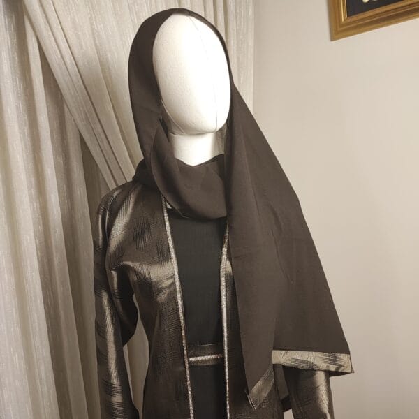 The Layali Mocha Luster Abaya is a timeless piece that blends richness and sophistication. Crafted from a luxurious fabric with a subtle sheen, this deep mocha brown Abaya exudes warmth and understated opulence. Its fluid silhouette drapes gracefully, while the delicate bronze-edged detailing adds a refined touch. Paired with a matching dark brown hijab or shawl, this Abaya is perfect for evening gatherings or elevating your everyday look with effortless charm.