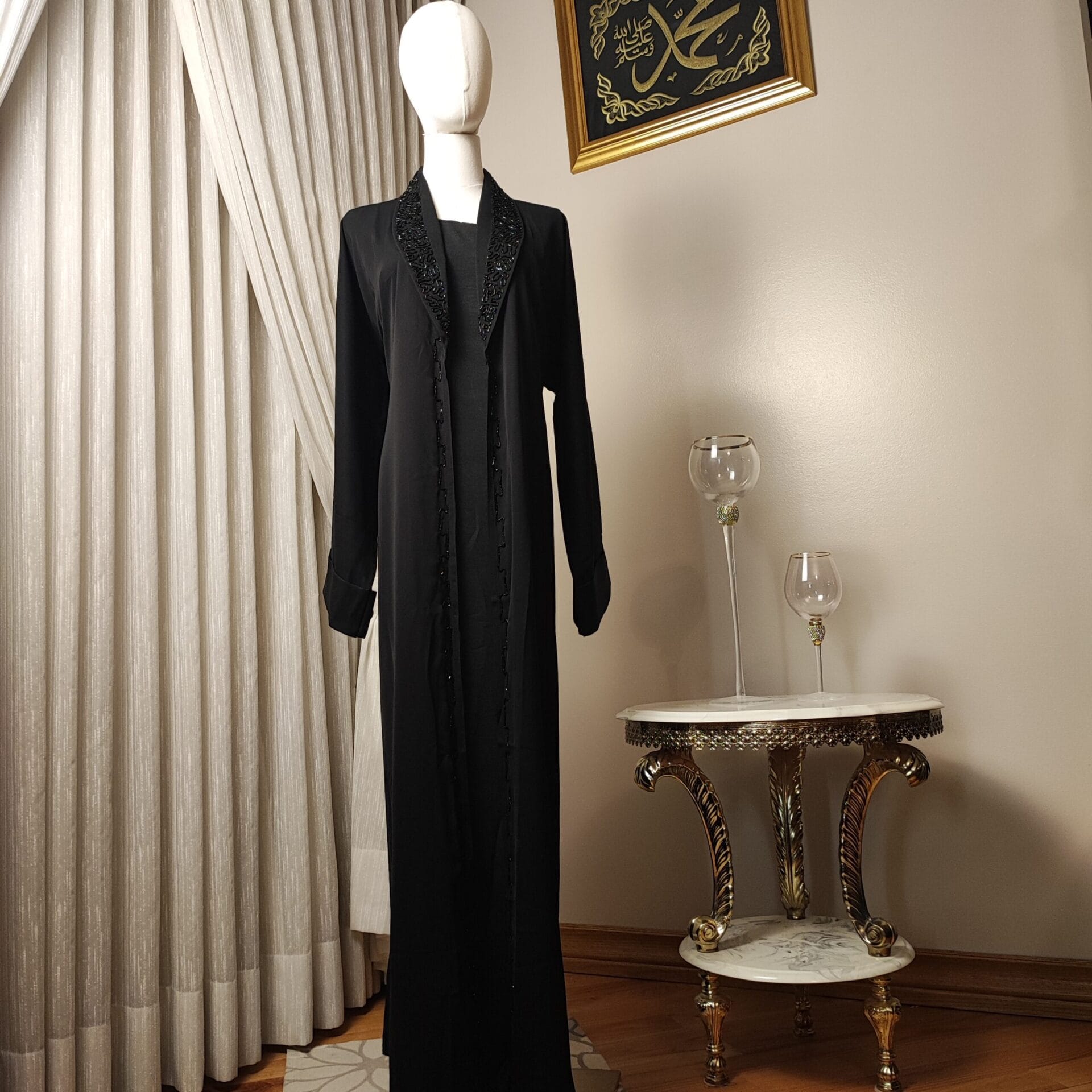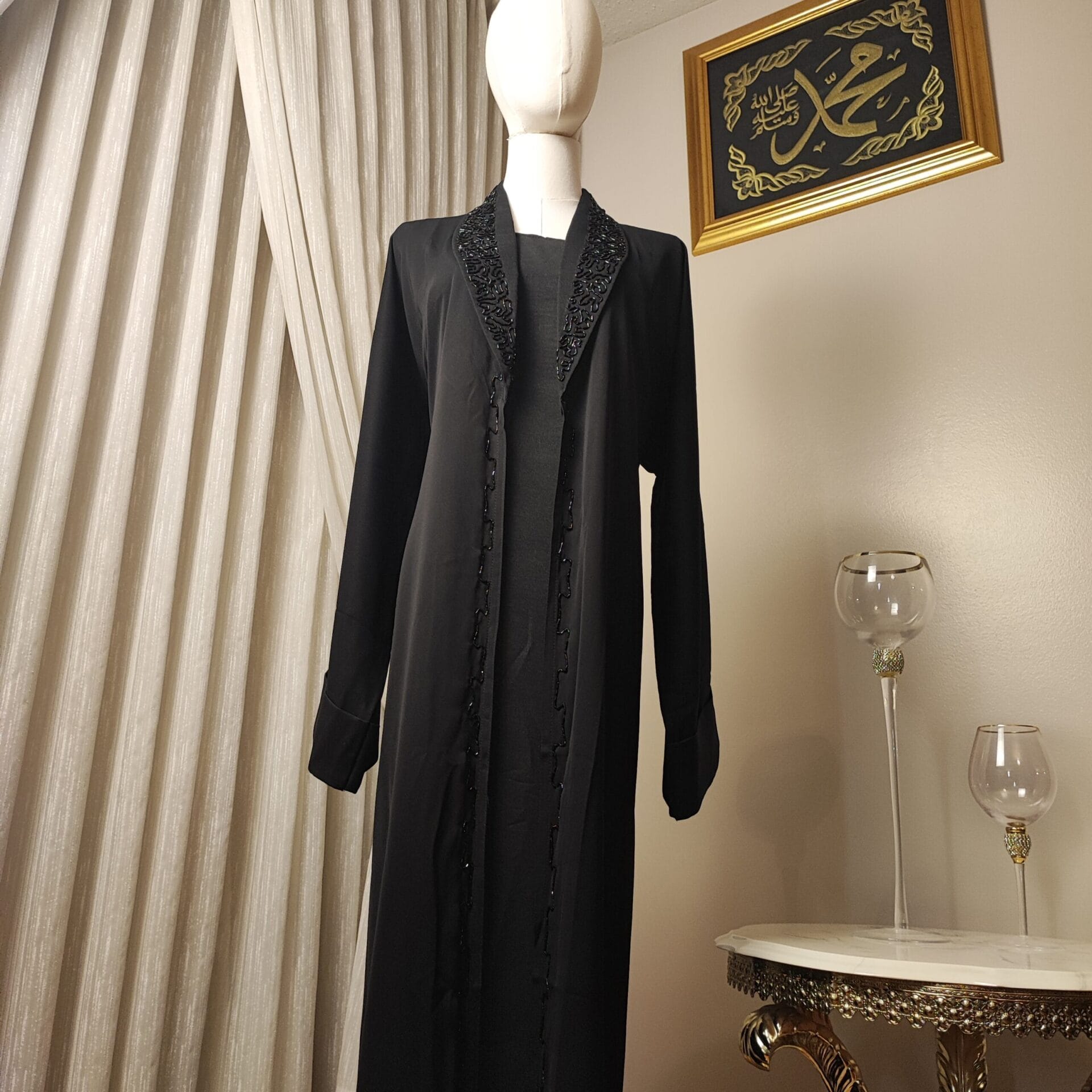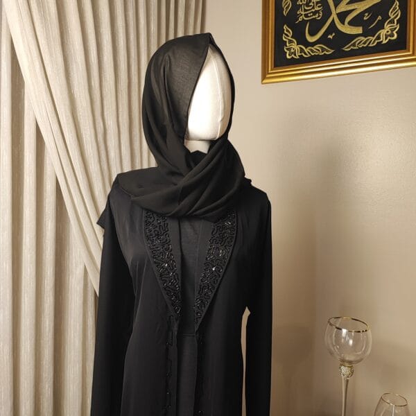 The Midnight Grace Suit Abaya is designed for the woman who values both tradition and modern elegance. Featuring exquisite black-on-black embroidery along the neckline, this Abaya is a testament to fine craftsmanship. Its soft, flowing fabric drapes beautifully, offering both comfort and poise. The delicate button details down the front add a touch of refinement, allowing you to style it open or closed with ease. Whether worn at a formal event or as part of your everyday wardrobe, the Midnight Grace Suit Abaya embodies sophistication, making it a must-have for those who appreciate timeless beauty in modest fashion.