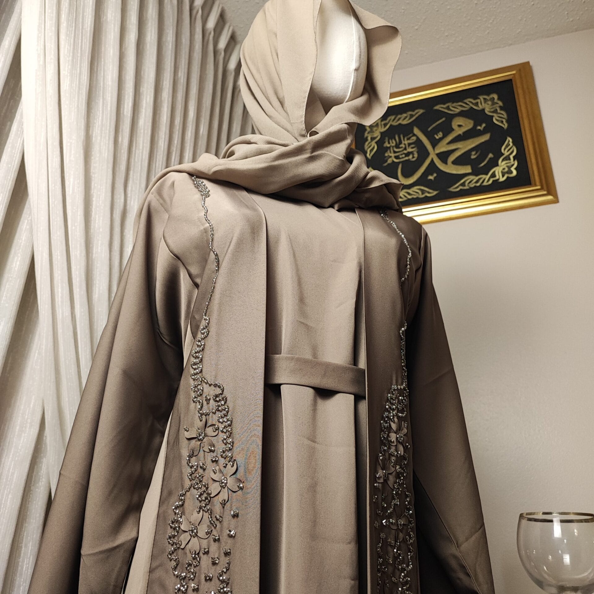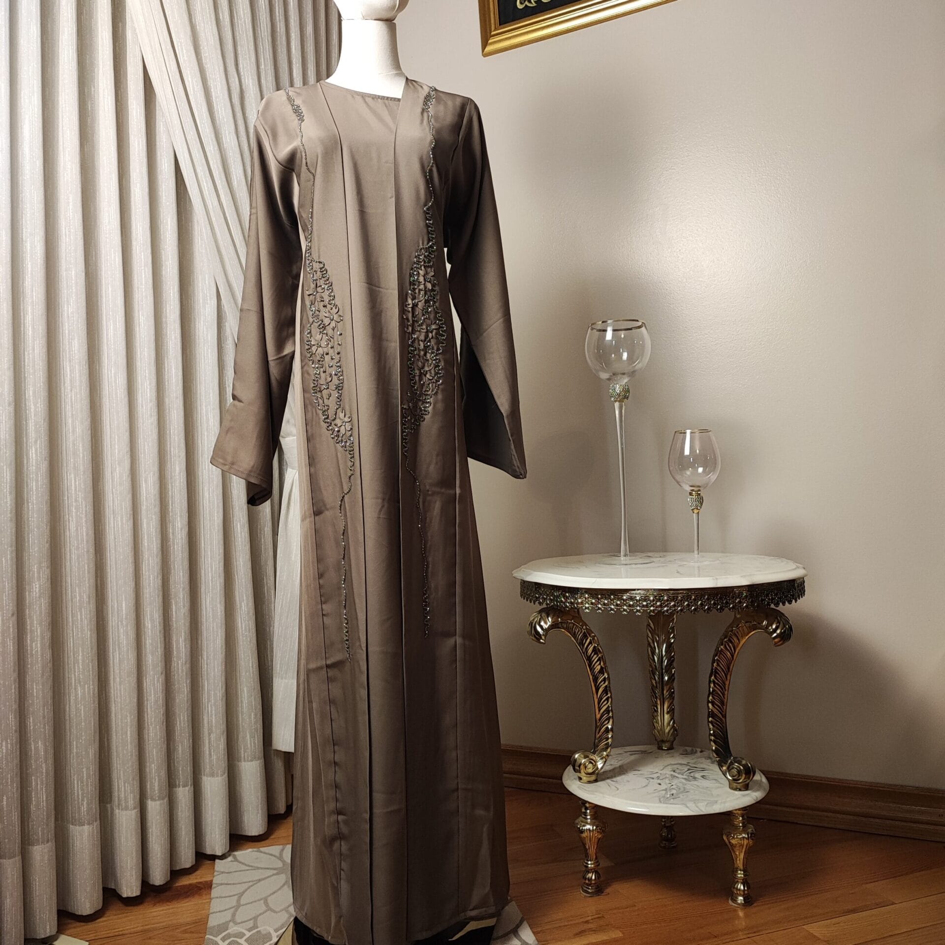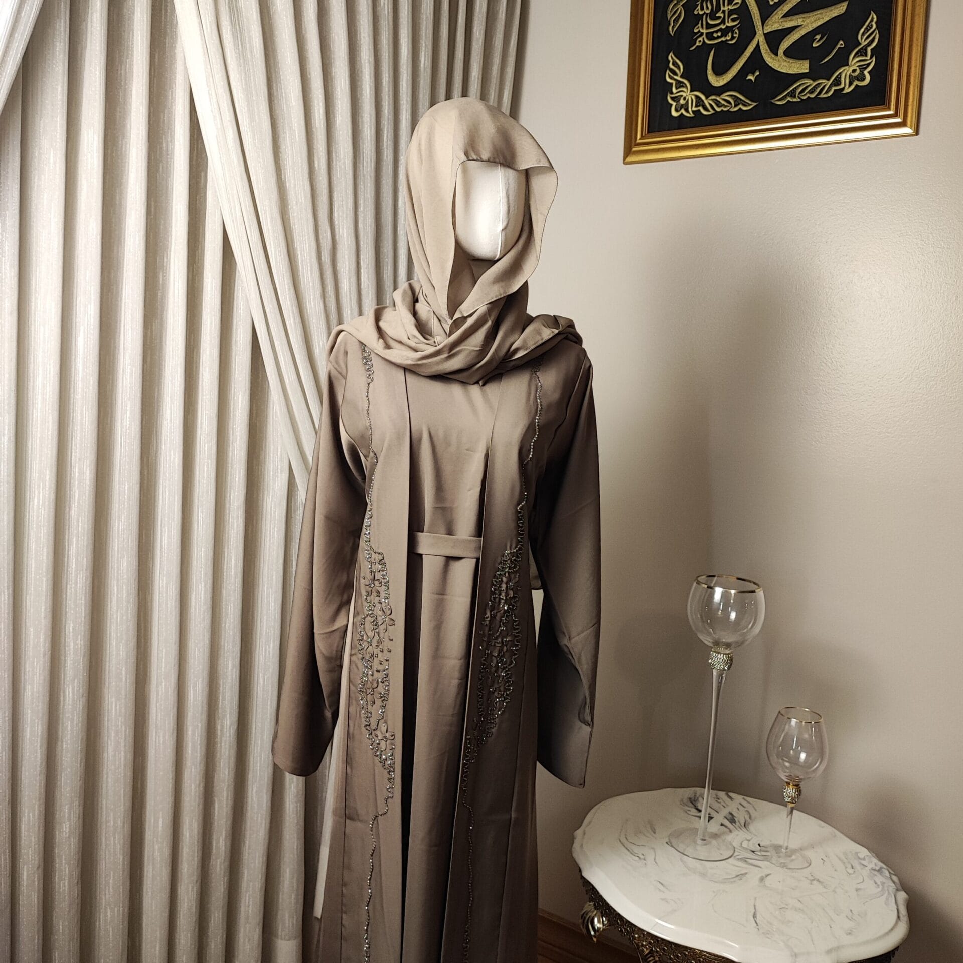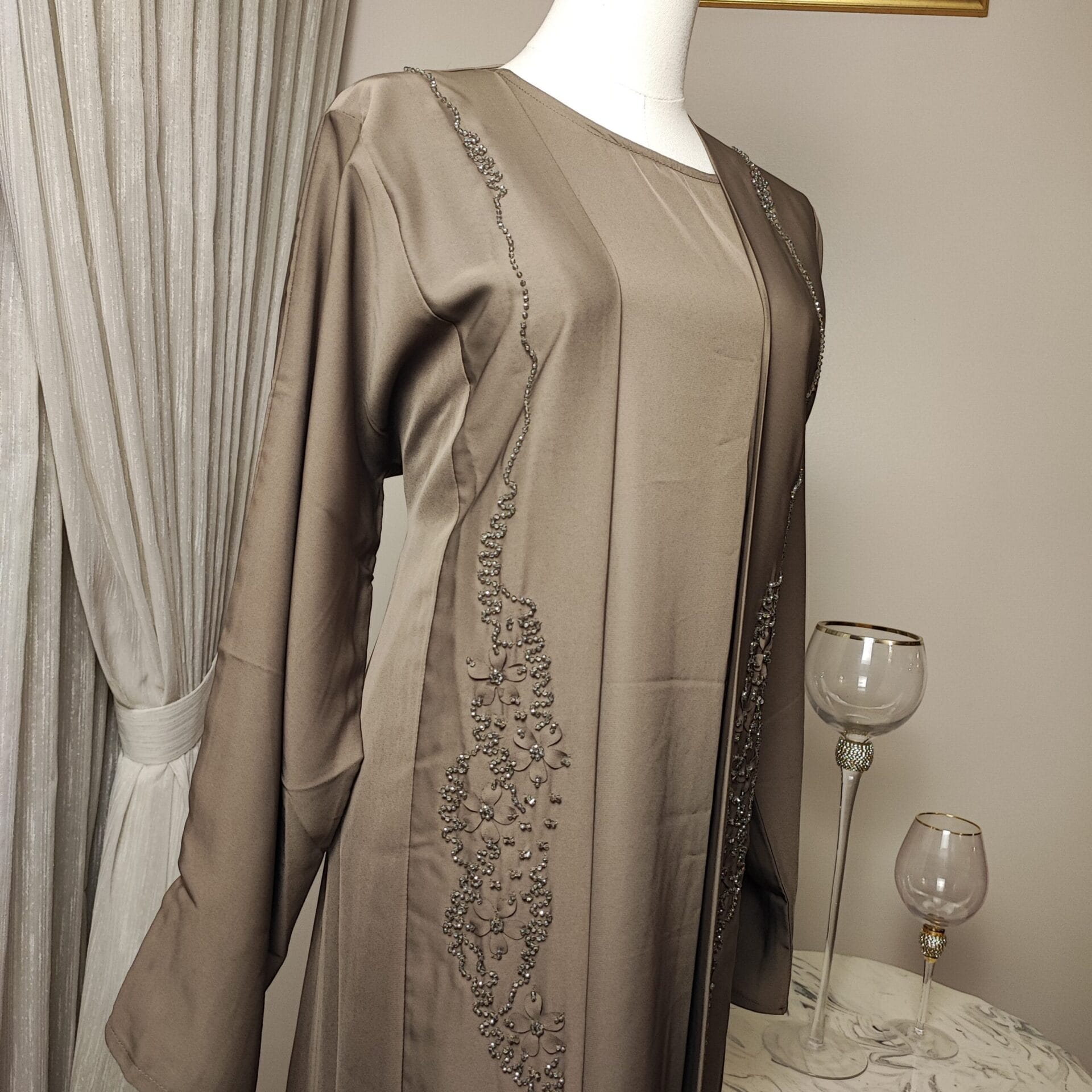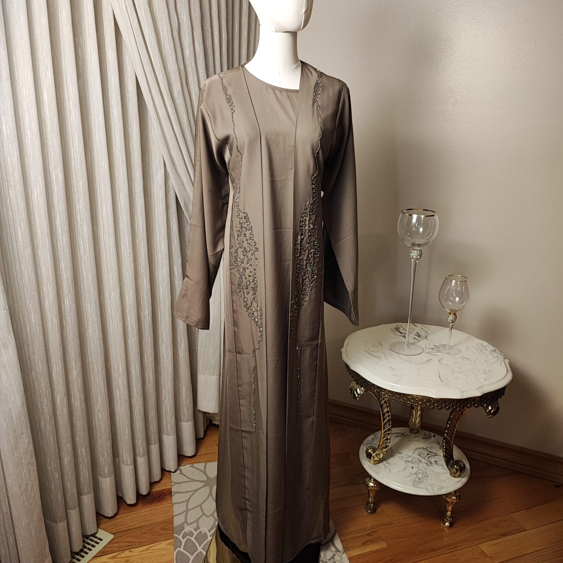The Mocha Elegance Abaya is a statement of refined beauty, crafted in a rich mocha hue that exudes warmth and sophistication. Delicate embroidery cascades along the front, adding a subtle touch of elegance to its flowing design. Perfect for formal occasions or everyday elegance, this Abaya blends traditional modesty with contemporary fashion. The soft, breathable fabric drapes beautifully, ensuring comfort without compromising on style. Complete with a matching hijab/shawl, the Mocha Elegance Abaya is a must-have for those who appreciate timeless grace.