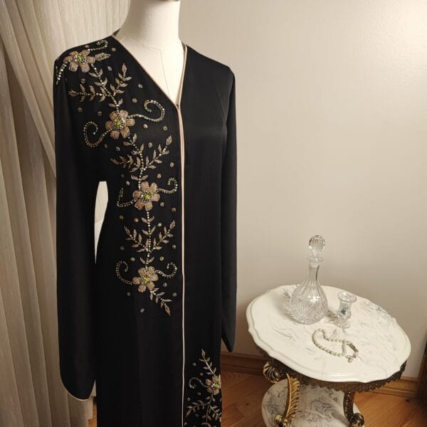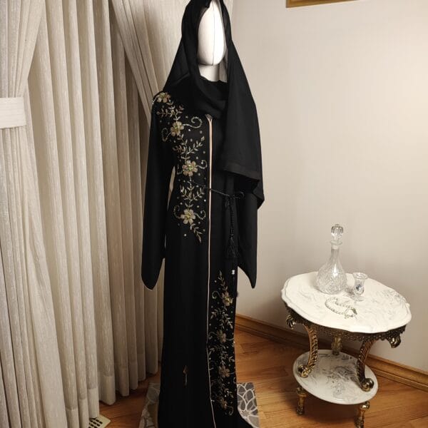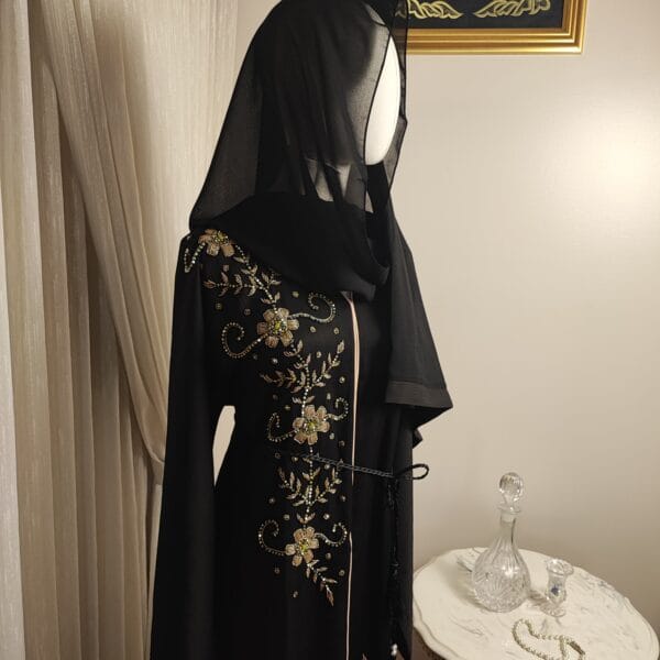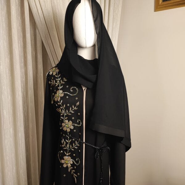 An elegant black Abaya with delicate golden embellishments, Noor Al-Layl captures the essence of grace and sophistication. Designed for the modern woman who appreciates timeless beauty.