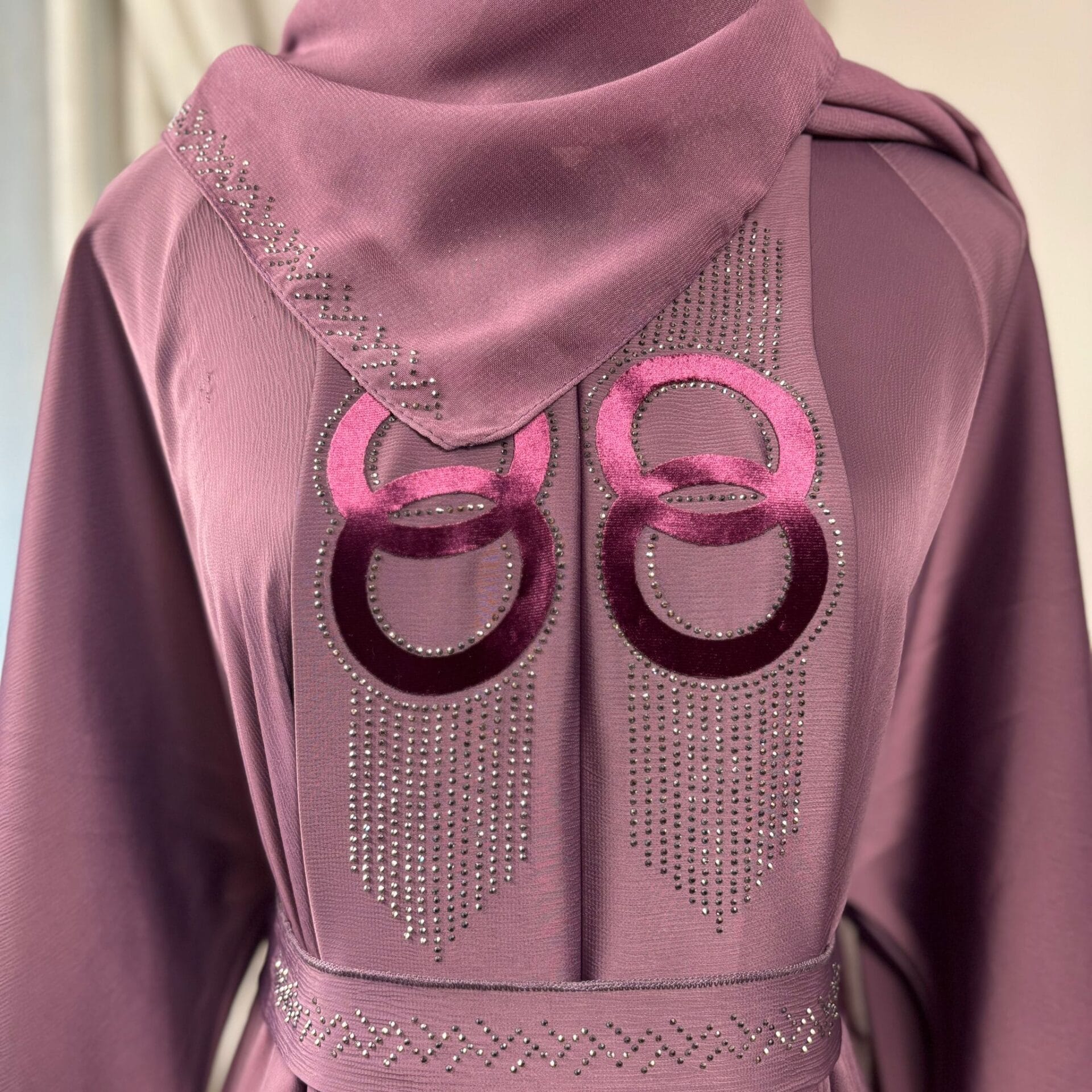 The Regal Loop Embellished Abaya is designed for timeless sophistication. It features unique circular embroidery across the bodice, enhanced with delicate beadwork and cascading details that bring a refined sparkle to the outfit. Crafted from a fluid fabric with a soft drape, it provides effortless comfort while maintaining an elegant silhouette. The attached matching scarf completes the look, making it ideal for weddings, special occasions, or upscale gatherings where style and grace are essential.
