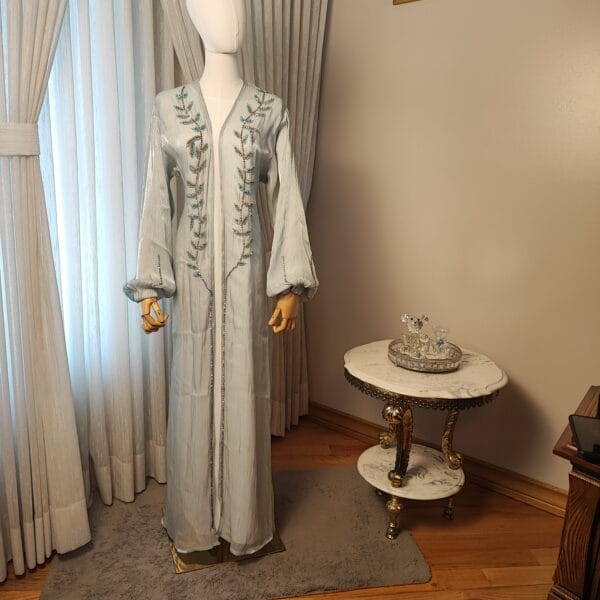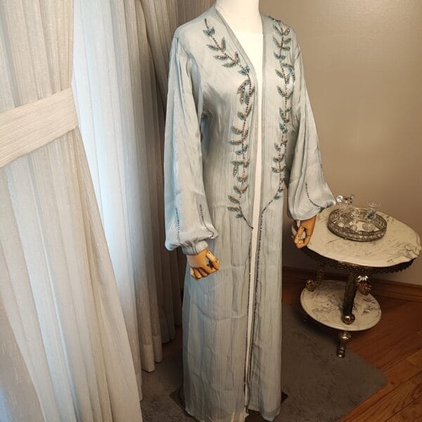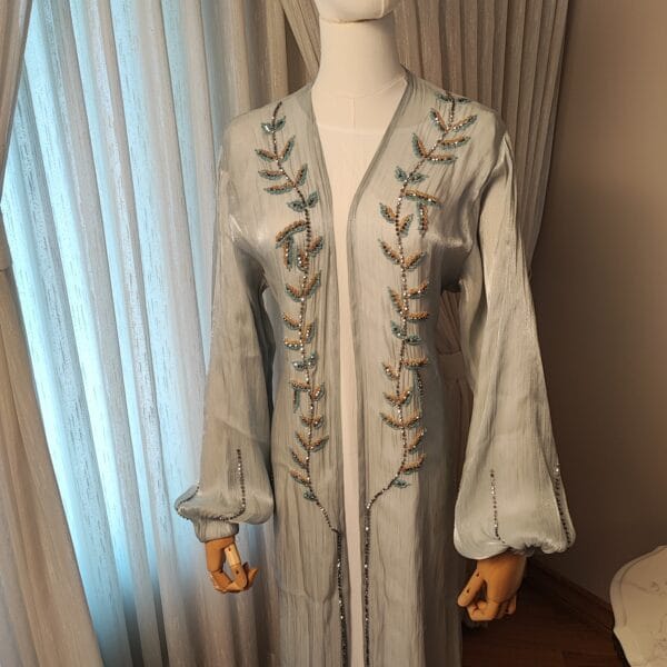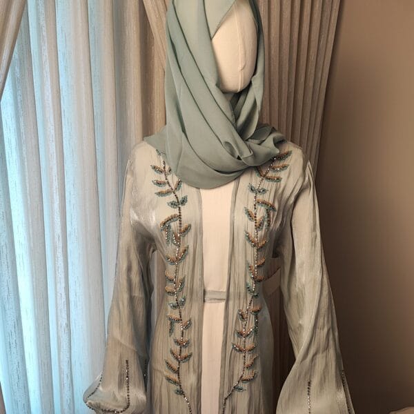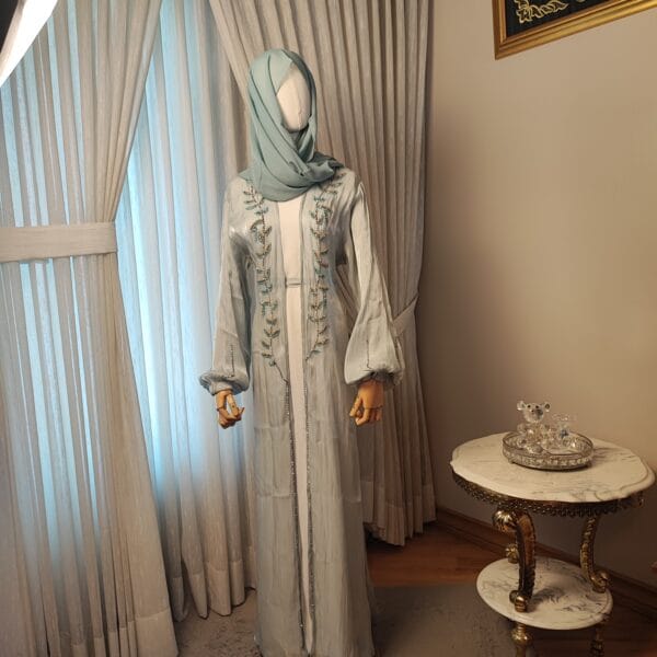 The Serene Elegance Abaya is a breathtaking piece designed for women who appreciate both modesty and elegance. Made from a subtly shimmering Celeste light blue fabric, this Abaya features intricate beaded embroidery in a delicate leaf pattern, adding a touch of sophistication. The flowing bell sleeves enhance its regal charm, while the open-front design makes it a versatile choice for layering over a modest dress or inner slip. Paired with a perfectly matching hijab/shawl, this Abaya is ideal for formal gatherings, Eid celebrations, or evening events, making you stand out with effortless grace.