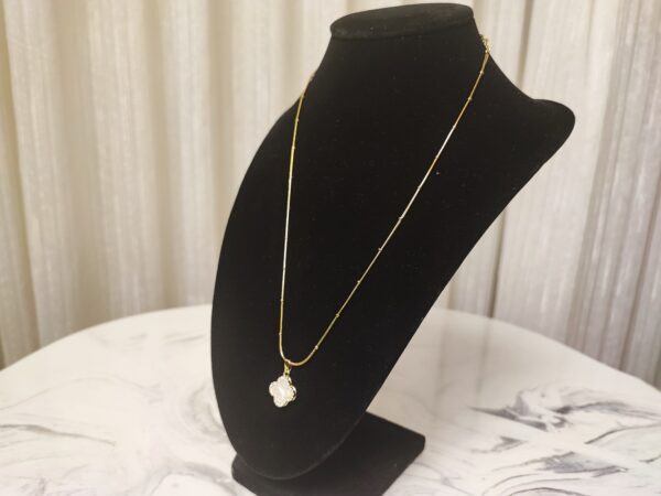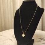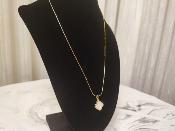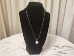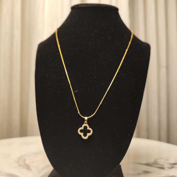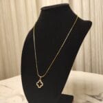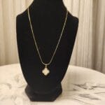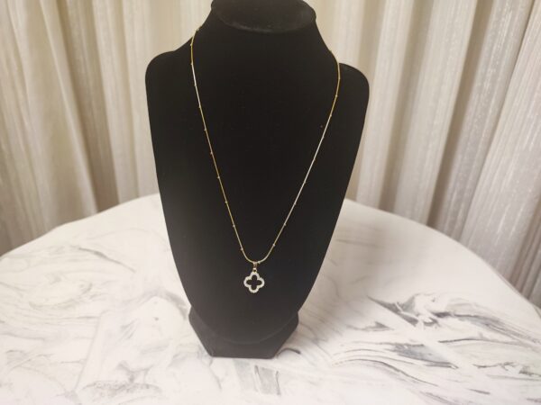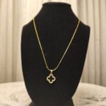 The Ethereal Clover Pendant features a striking black and white reversible design, embodying balance and versatility. Encased in a brass base with 22K gold plating, the pendant’s elegant four-leaf clover shape is outlined with shimmering natural zircon stones for a touch of brilliance. Suspended on a matching brass chain with 22K gold plating, this piece is perfect for those who seek beauty with a touch of symbolism. Wear it for luck, style, or both.
