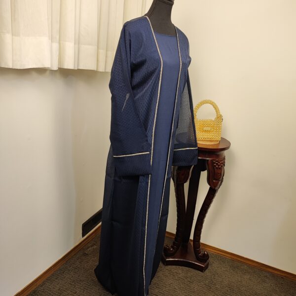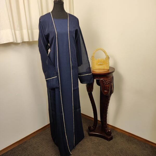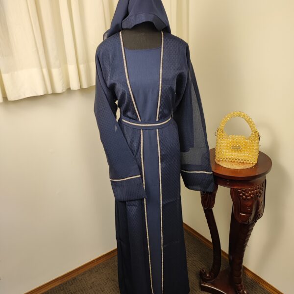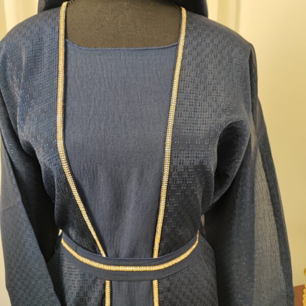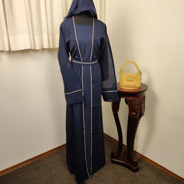 This abaya features a rich dark grey and navy blue color, accentuated with subtle texture for added depth. The flowing silhouette is complemented by wide sleeves and a stylish matching shawl, offering a contemporary twist on the classic design.