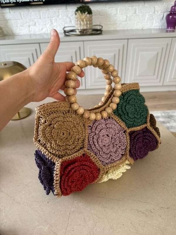 Introducing the Handmade Crochet Patchwork Multi-Color Floral Bag, an exquisite and colorful accessory that brings together the rich heritage of Turkish crochet craftsmanship with a modern bohemian flair. Handcrafted with premium paper raffia fibre, each floral patch is meticulously crocheted and assembled into a harmonious patchwork design, creating a stunning visual appeal. The smooth wooden bead handles provide a natural, comfortable grip, making this bag an ideal choice for casual outings, weekend getaways, or as a standout piece for special occasions. Celebrate craftsmanship and style with this one-of-a-kind crochet handbag.