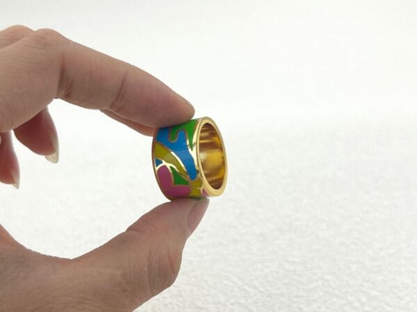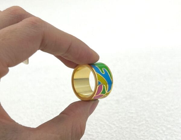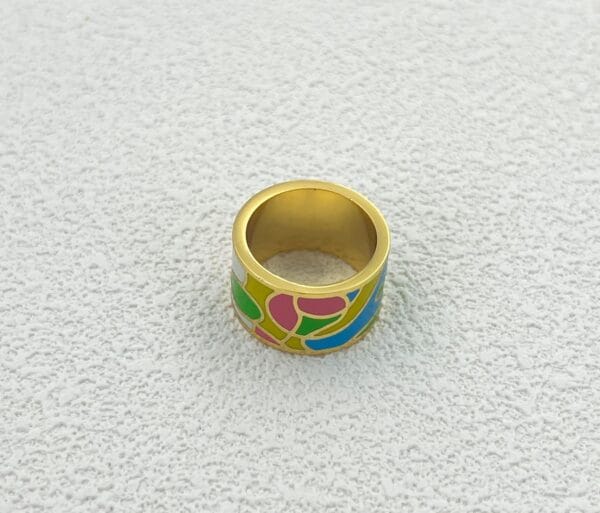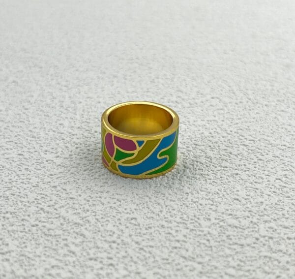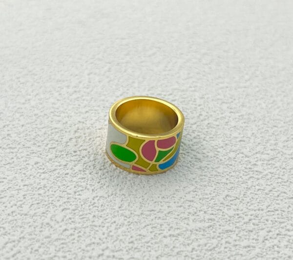 Infuse your hijab style with a touch of freshness and charm with this 18K gold plated ring, featuring a delicate floral-inspired design in pastel shades of pink, green, blue, and white. The soft yet vibrant colors elegantly contrast with the luxurious gold frame, creating a piece that embodies grace and sophistication. Perfect for adding a light, feminine accent to your everyday or special occasion looks.