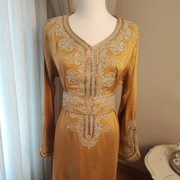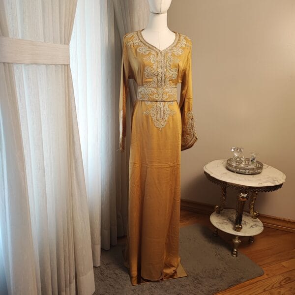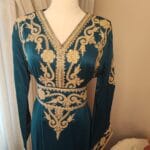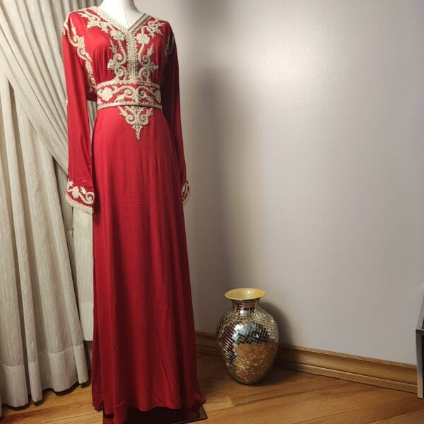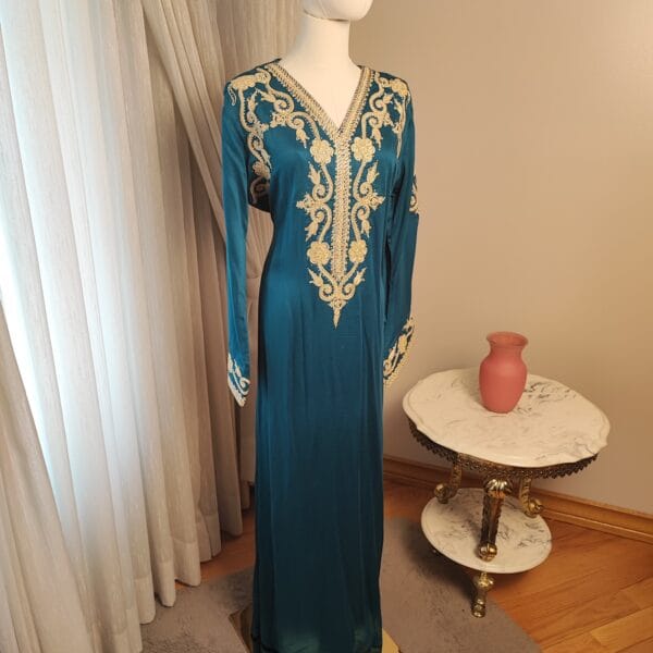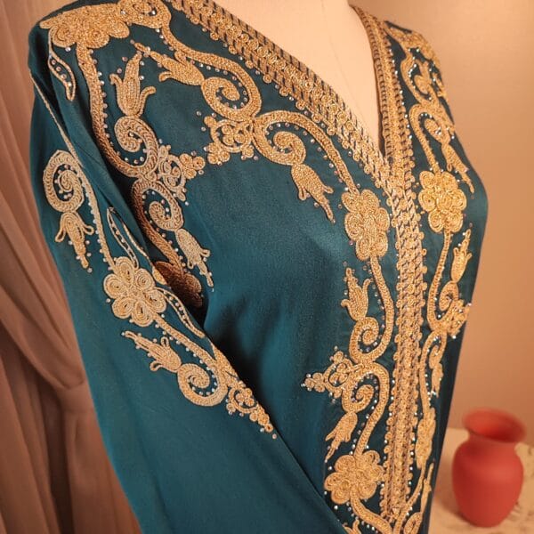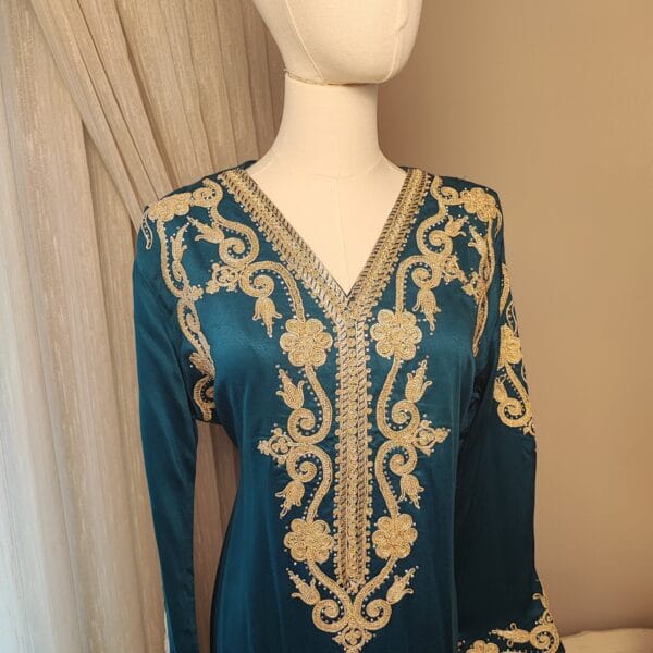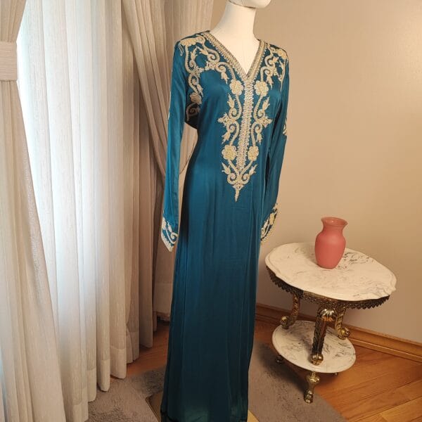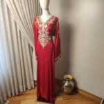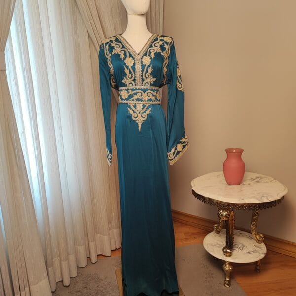 Introducing the Layali Luxe Kaftan, a true embodiment of sophistication from our Kaftan Collection. Designed to make a statement, this kaftan features ornate embroidery that gracefully adorns the neckline, bodice, and sleeves, creating an effortlessly regal look. The deep rich colorful fabric, flowing gracefully to the floor, adds a touch of drama and refinement.
