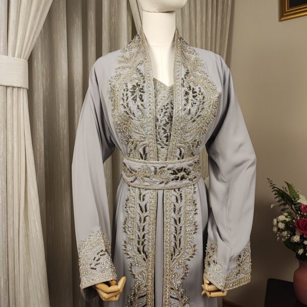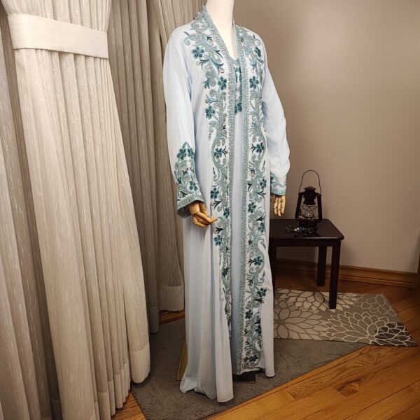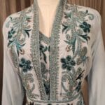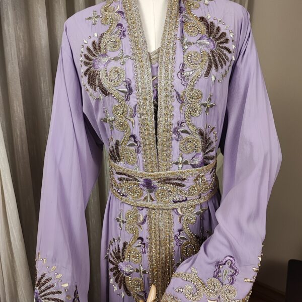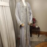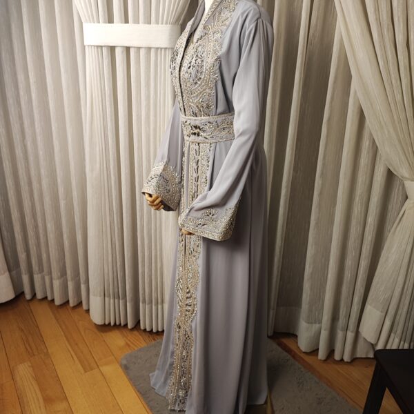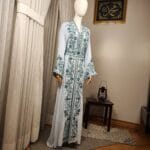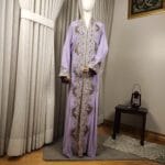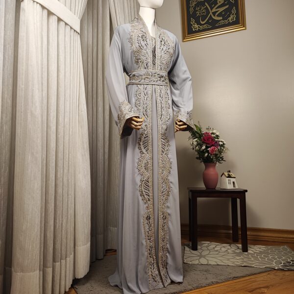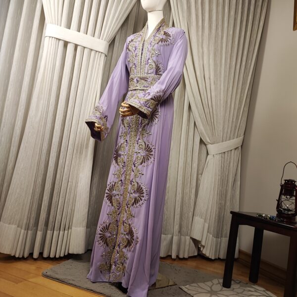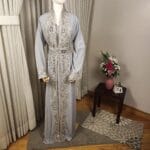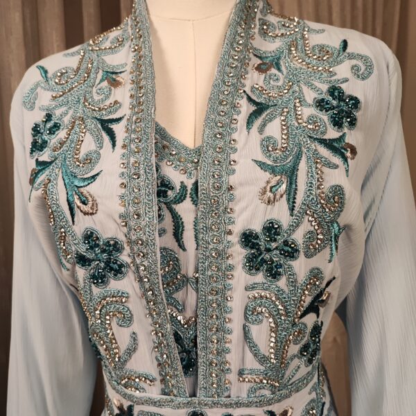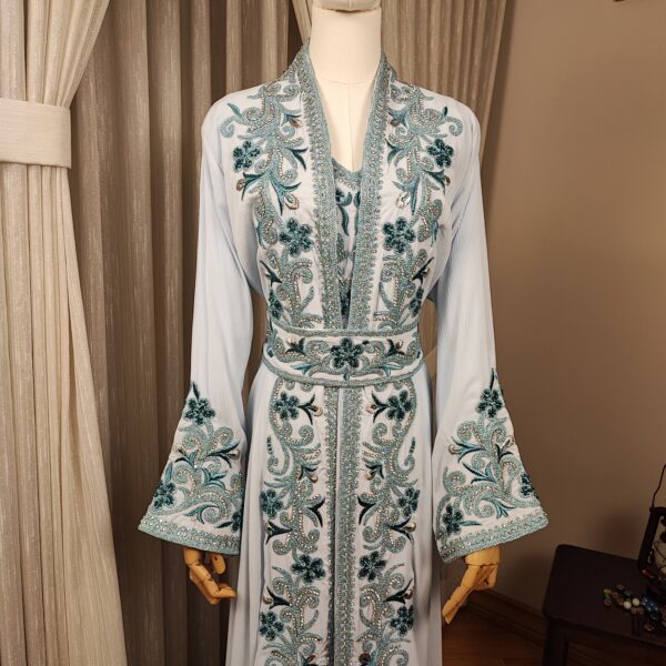 The design of this kaftan perfectly blends tradition with modernity. Its fluid fabric ensures natural elegance and absolute comfort, making it ideal for grand occasions such as weddings, engagements, or prestigious events. The long sleeves, intricately detailed with embroidery.