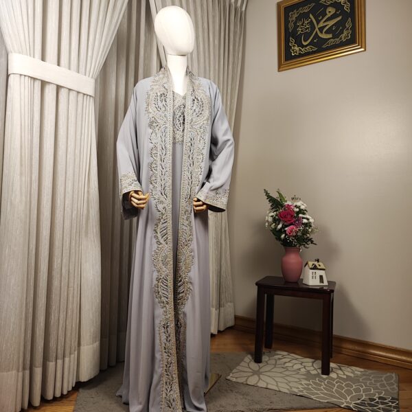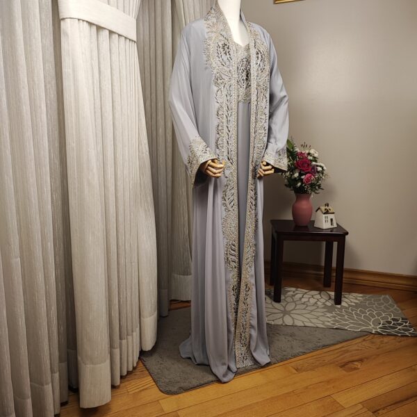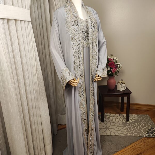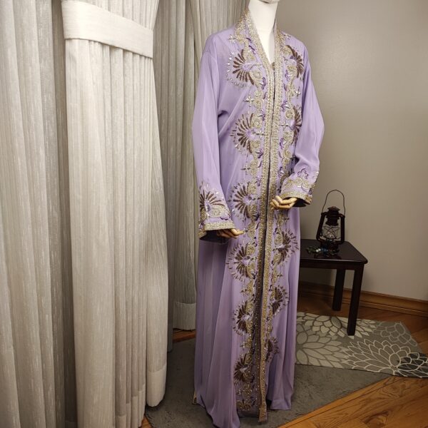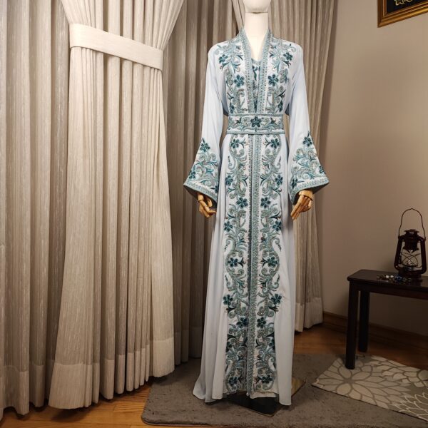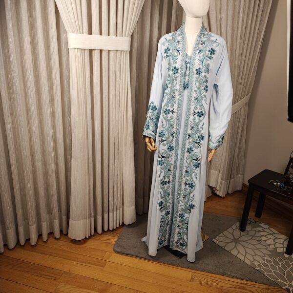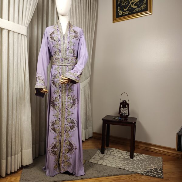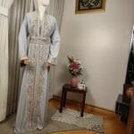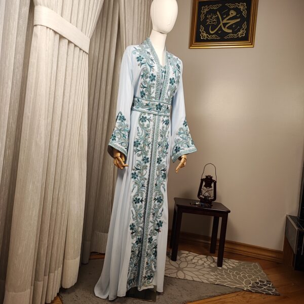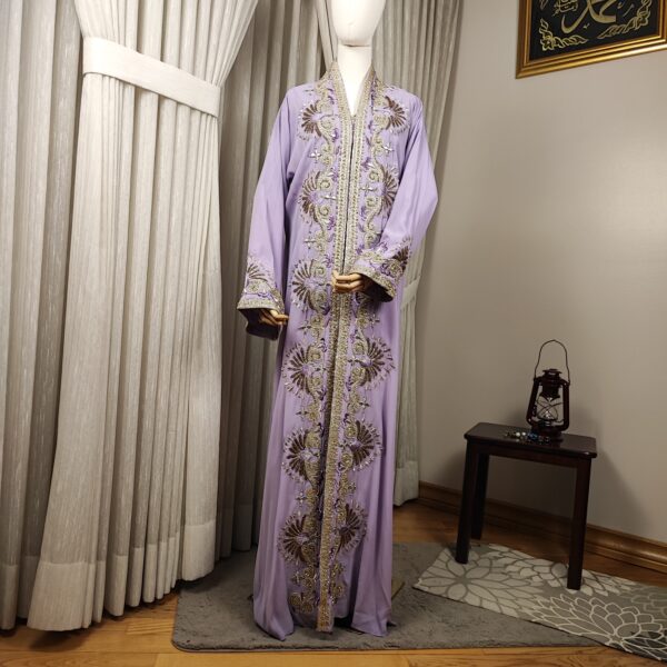 The design of this kaftan perfectly blends tradition with modernity. Its fluid fabric ensures natural elegance and absolute comfort, making it ideal for grand occasions such as weddings, engagements, or prestigious events. The long sleeves, intricately detailed with embroidery.