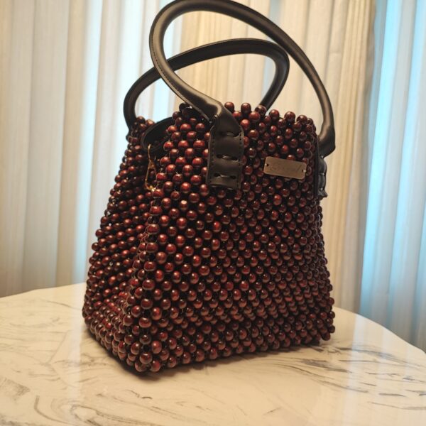This Natura Luxe handbag is a stunning fusion of natural craftsmanship and modern elegance. Its deep burgundy wooden beads are meticulously arranged to form a structured and sophisticated silhouette, creating a visually rich and textured surface. The sturdy black leather handles and accents provide a bold contrast, enhancing both durability and style. A silver-toned branded nameplate adds a refined finishing touch, while the spacious interior makes it both fashionable and functional. This handbag features an open-top structure with a flexible yet sturdy frame, allowing for easy access to essentials while maintaining its elegant shape