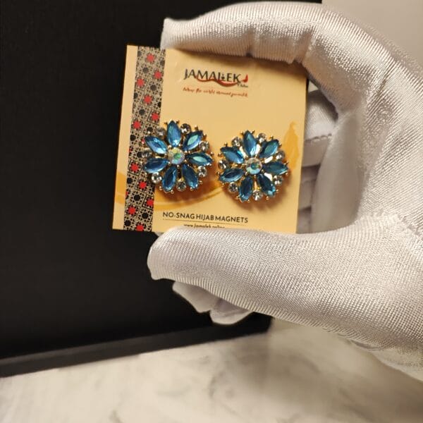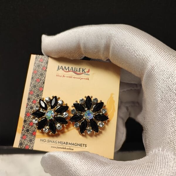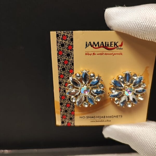 The celestial harmony rhinestone collection no-snag hijab magnets are stylish and functional accessories designed to secure your hijab or shawl without damaging the fabric. These magnets feature vibrant rhinestones that add a touch of sparkle and elegance to your look, while their no-snag design ensures a smooth, secure fit without catching or pulling on the fabric. Ideal for everyday wear or special occasions, they are easy to use and offer a sleek, secure alternative to traditional pins.