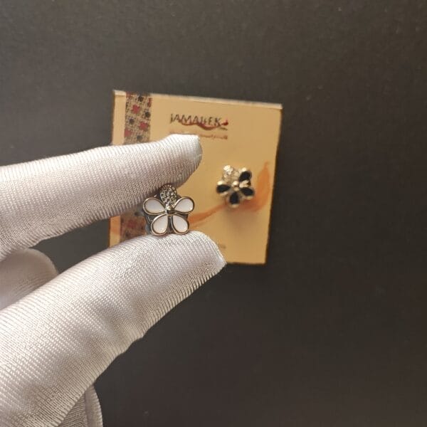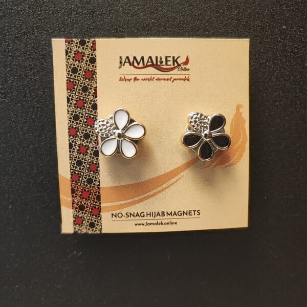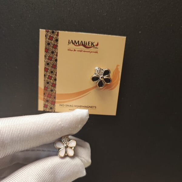 A stunning floral-themed hijab magnet set, combining white and black enamel petals with sparkling details for a refined touch to any outfit.