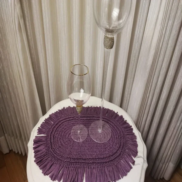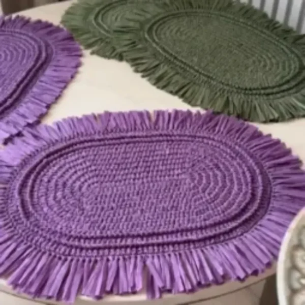 Bring a touch of artisanal craftsmanship to your table with this stunning oval crochet-woven table placemat in a rich purple hue. Made from high-quality, eco-friendly premium paper raffia fibers, this placemat offers a stylish blend of durability and aesthetic appeal. The intricate woven design, paired with its elegant fringe detailing, creates a unique and inviting atmosphere for your dining space. Whether for daily use or special occasions, this placemat provides excellent protection against heat and spills while enhancing your décor. Easy to clean and maintain, it’s a perfect addition to any modern or traditional home.