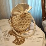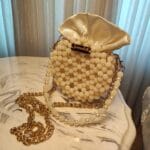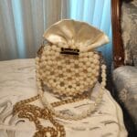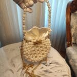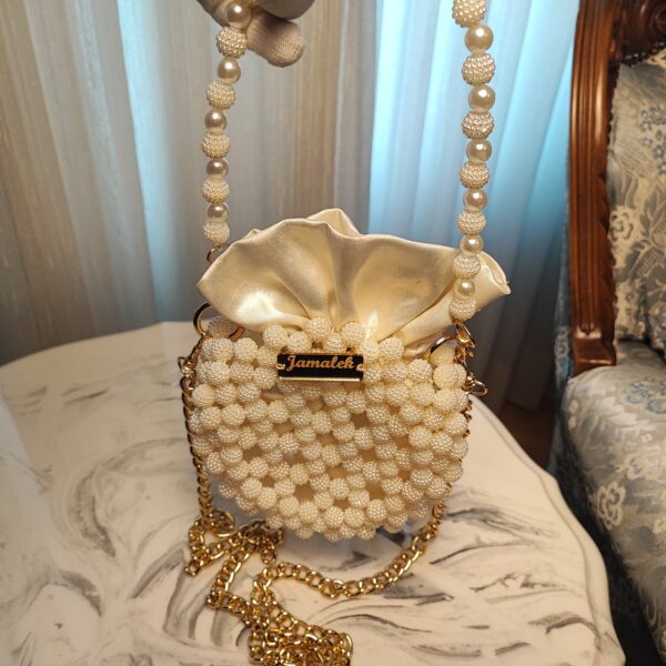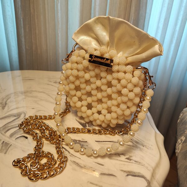 This elegant handbag is a masterpiece of craftsmanship, featuring delicate pearl-textured acrylic beads arranged in a circular design. The bag is adorned with a luxurious satin fabric closure that softly gathers at the top, resembling a blooming flower or a delicate pouch. A signature gold-toned “Jamalek” nameplate adds a touch of sophistication. The handbag also comes with a dual-strap design—one featuring gold chain links and the other incorporating pearl and beaded details for an ultra-feminine touch.