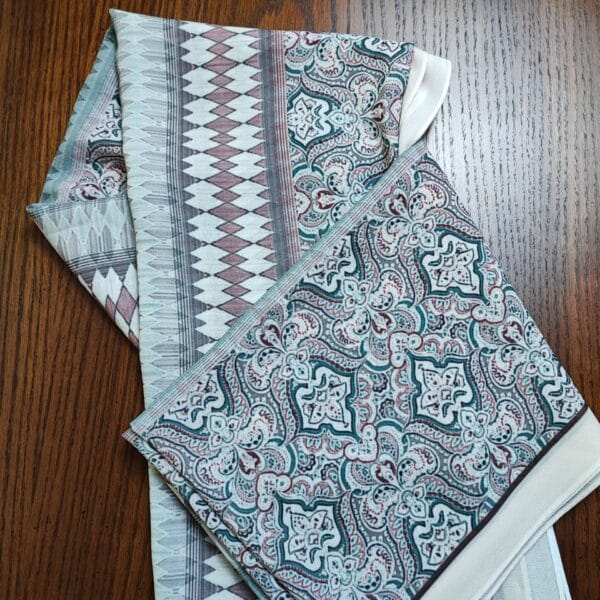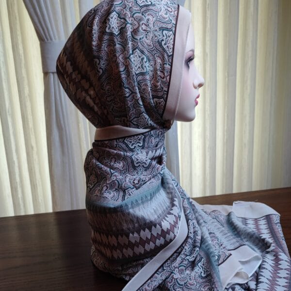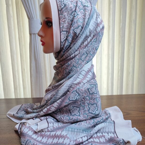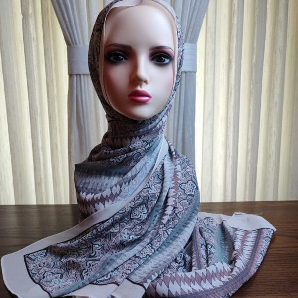 A premium printed chiffon shawl featuring an intricate geometric and paisley-inspired motif in cool blues, purples, and grays. The lightweight fabric drapes softly with a subtle sheen, delivering an upscale, fashion-forward vibe. The generous size and refined border detailing allow versatile wrapping—from classic folds to modern drapes. Ideal for evening events or upscale daywear, it adds depth and coordinates beautifully with cool-toned outfits.