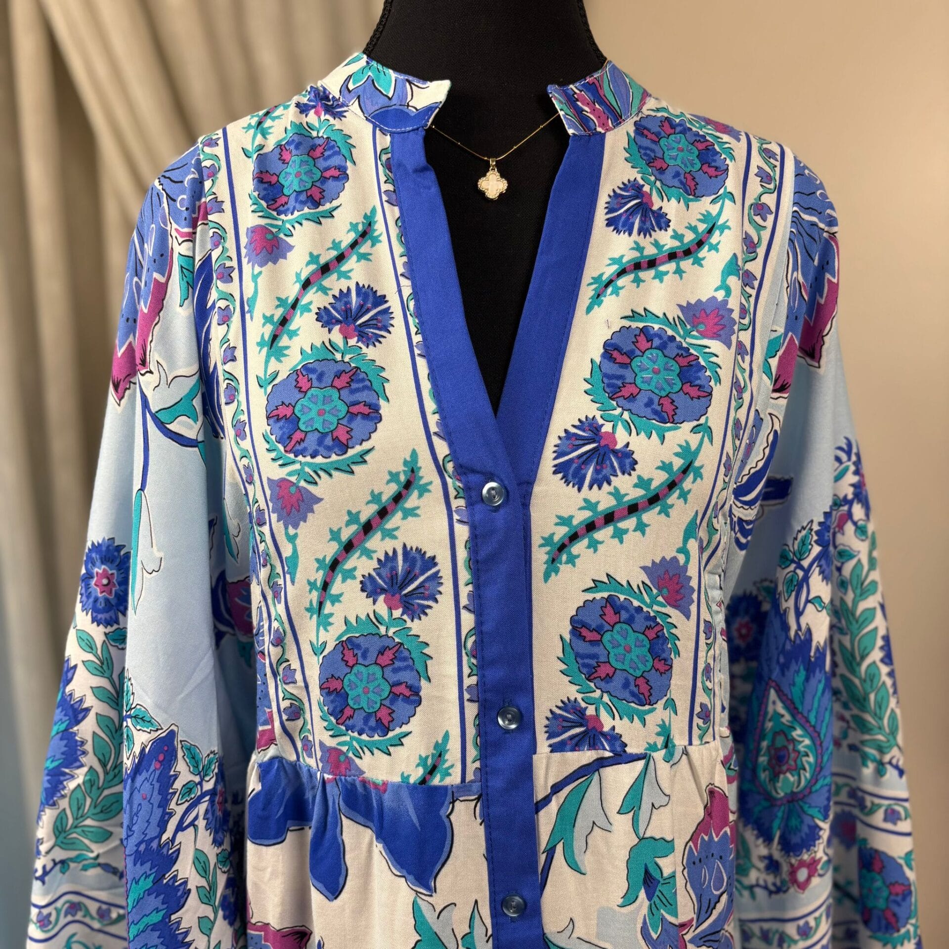 The Indigo Garden Maxi Summer dress radiates romantic boho-luxe. Crafted in a soft, flowing silk-like fabric, it features a vibrant floral print in blues and purples, a structured button-down front, and a wide, fluid skirt that tiers into a graceful, printed border. The long, airy sleeves gather at the cuffs, adding movement with every step. Designed for day-to-night wear, it transitions from a sunlit brunch to an evening soiree with ease—just switch heels for sandals and add a delicate necklace.