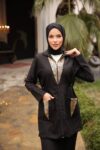 Turn heads with the Jamalek Lamis Metallic Accent Set, a sporty-chic take on modest fashion. This black two-piece set features a zip-up top with shimmering gold metallic inserts on the pockets and chest, paired with matching straight-leg trousers. The drawstring waist adds function and flair, allowing for a customizable fit. Lamis is perfect for women who want to mix bold style with practicality—whether for travel, casual outings, or laid-back luxe looks.