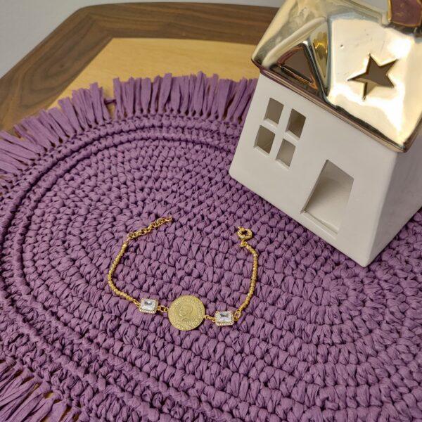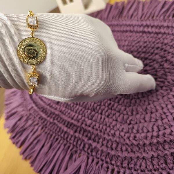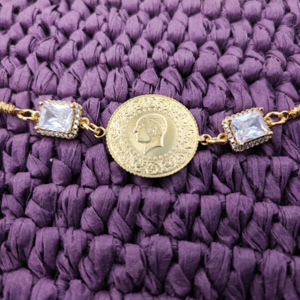 The Zircon Elegance Bracelet is a stunning piece of jewelry that combines sophistication with a touch of whimsy. Crafted from 22k gold-plated brass, this bracelet features a beautifully detailed medallion in the center, giving it a vintage charm. Flanking the medallion are two sparkling natural zircon stones that add a contemporary twist and a hint of glamour.